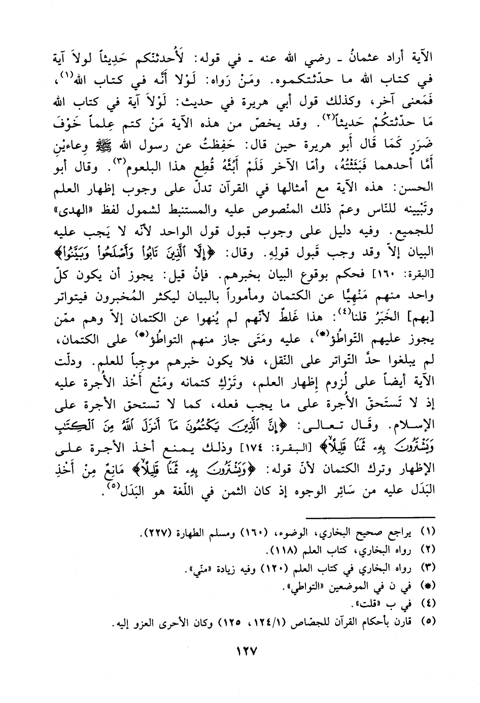 الآية أراد عثمان -رضي الله عنه- في قوله: لأحدثنكم حديثًا لولا آية في كتاب الله ما حدثتكموه, من رواه: لولا أنه في كتاب الله، فمعنى آخر، وكذلك قول أبي هريرة في حديث: لولا آية في كتاب الله ما حدثتكم حديثًا. وقد يخص من هذه الآية من كتم علمًا خوف ضرر كما قال أبو هريرة حين قال: حفظت عن رسول الله صلى الله عليه وسلم وعاءين؛ أما أحدهما فبثثته، وأما الآخر فلم أبثه قطع هذا البلعوم. وقال أو الحسن: هذه الآية مع أمثالها في القرآن تدل على وجوب إظهار العلم وتبيينه للناس وعم ذلك المنصوص عليه والمستنبط لشمول لفظ ((الهدى)) للجميع. وفيه دليل على وجوب قبول قول الواحد لأنه لا يجب عليه البيان إلا وقد وجب قبول قوله. وقال: {إلا الذين تابوا وأصلحوا وبينوا} [البقرة: 160] فحكم بوقوع البيان بخبرهم. فإن قيل: يجوز أن يكون كل واحد منهم منهيًا عن الكتمان ومأمورًا بالبيان ليكثر المخبرون فيتواتر [بهم] الخبر قلنا: هذا غلط لأنهم لم ينهوا عن الكتمان إلا وهم ممن يجوز عليهم التواطؤ، عليه ومتى جاز منهم التواطؤ على الكتمان، لم يبلغوا حد التواطؤ عليه ومتى جاز منهم النواطؤ على الكتمان لم يبلغوا حد التواتر على النقل، فلا يكون خبرهم موجبًا للعلم. ودلت الآية أيضًا على لزوم إظهار العلم، وترك كتمانه ومنع أخذ الأجرة عليه إذ لا تستحق الأجرة على ما يجب فعله، كما لا تستحق الأجرة على الإسلام. وقال تعالى: {إن الذين يكتمون ما أنزل الله من الكتاب ويشترون به ثمنًا قليلًا} [البقرة: 174] وذلك يمنع أخذ الأجرة على الإظهار وترك الكتمان لأن قوله: {ويشترون به ثمنًا قليلًا} مانع من أخذ الأجرة على الإظهار وترك الكتمان لأن قوله: {ويشترون به ثمنًا قليلًا} مانع من أخذ البدل عليه من سائر الوجوه إذ كان الثمن في اللغة هو البدل.