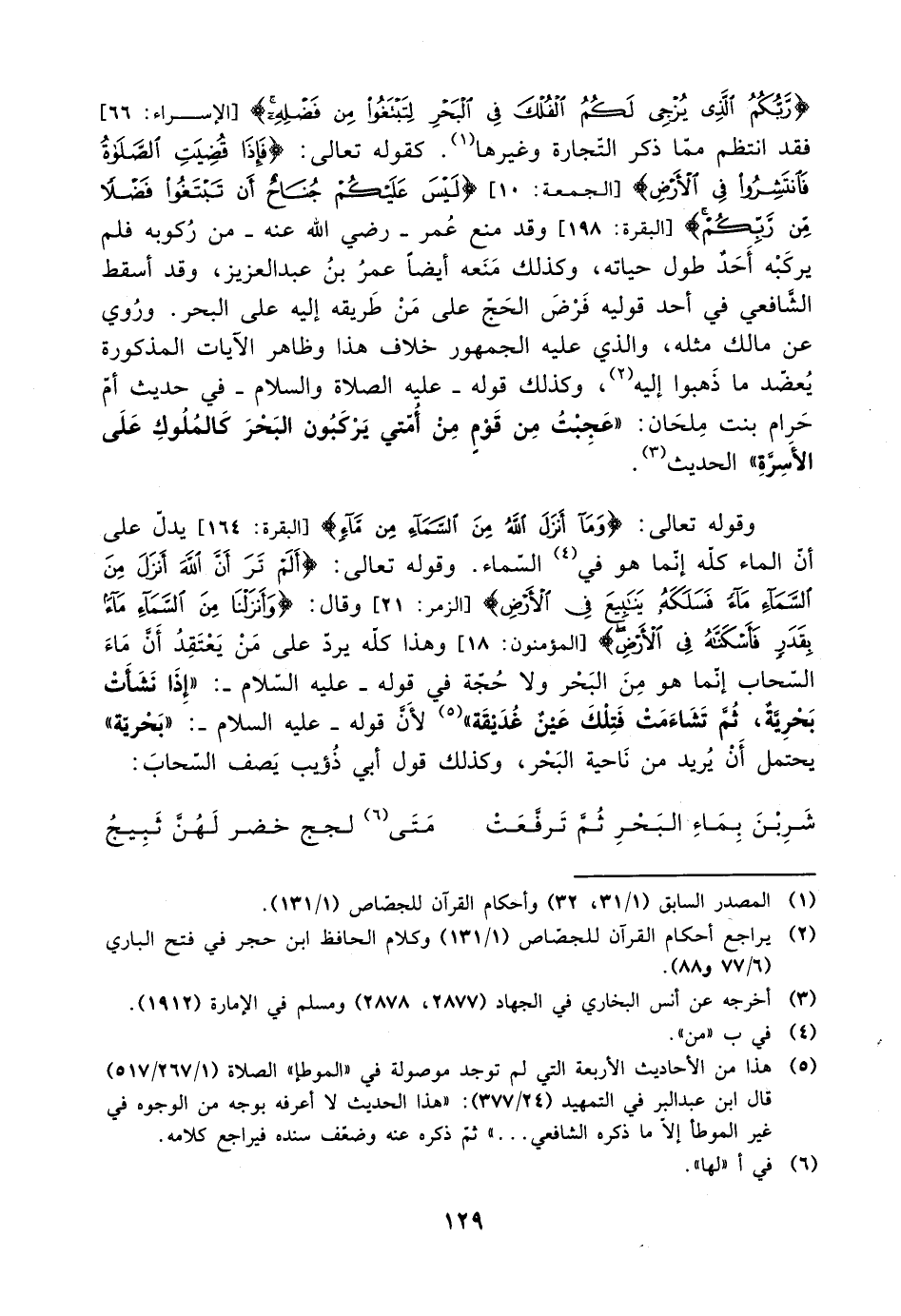 {ربكم الذي يزجي لكم الفلك في البحر لتبتغوا من فضله} [الإسراء: 62] فقد انتظم مما ذكر التجارة وغيرها. كقوله تعالى: {فإذا قضيت الصلاة فانتشروا في الأرض} [الجمعة: 10] {ليس عليكم جناح أن تبتغوا فضلًا من ربكم} [البقرة: 198] وقد منع عمر -رضي الله عنه- من ركوبه فلم يركبه أحد طول حياته، وكذلك منعه أيضًا عمر بن عبد العزيز، وقد أسقط الشافعي في أحد قوليه فرض الحج على من طريقه إليه على البحر. وروي عن مالك مثله، والذي عليه الجمهور خلاف هذا وظاهر الآيات المذكورة يعضد ما ذهبوا إليه، وكذلك قوله -عليه الصلاة والسلام- في حديث أم حرام بنت ملحان: ((عجبت من قوم من أمتي يرطبون البحر كالملوك على أسرة)) الحديث.