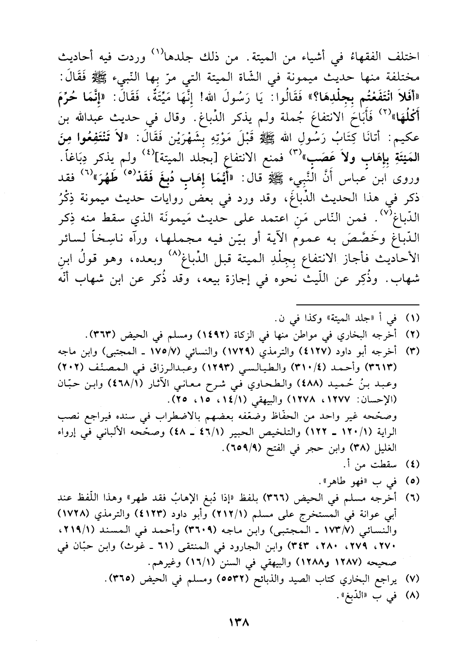 اختلف الفقهاء في أشياء من الميتة. ومن ذلك جلدها وردت فيه أحاديث مختلفة منها حديث ميمونة في الشاة الميتة التي مر بها النبي صلى الله عليه وسلم فقال: ((أفلا انتفعتم بجلدها؟ )) فقالوا: يا رسول الله! إنها ميتة، فقال: ((إنما حرك أكلها)) فأباح الانتفاع جملة ولم يذكر الدباغ. وقال في حديث عبد الله بن عكيم: أتانا كتاب رسول الله صلى الله عليه وسلمم قبل موته بشهرين فقال: ((لا تنتفعوا من الميتة بإهاب ولا عصب)) فمنع الانتفاع [بجلد الميتة] ولم يذكر دباغًا.