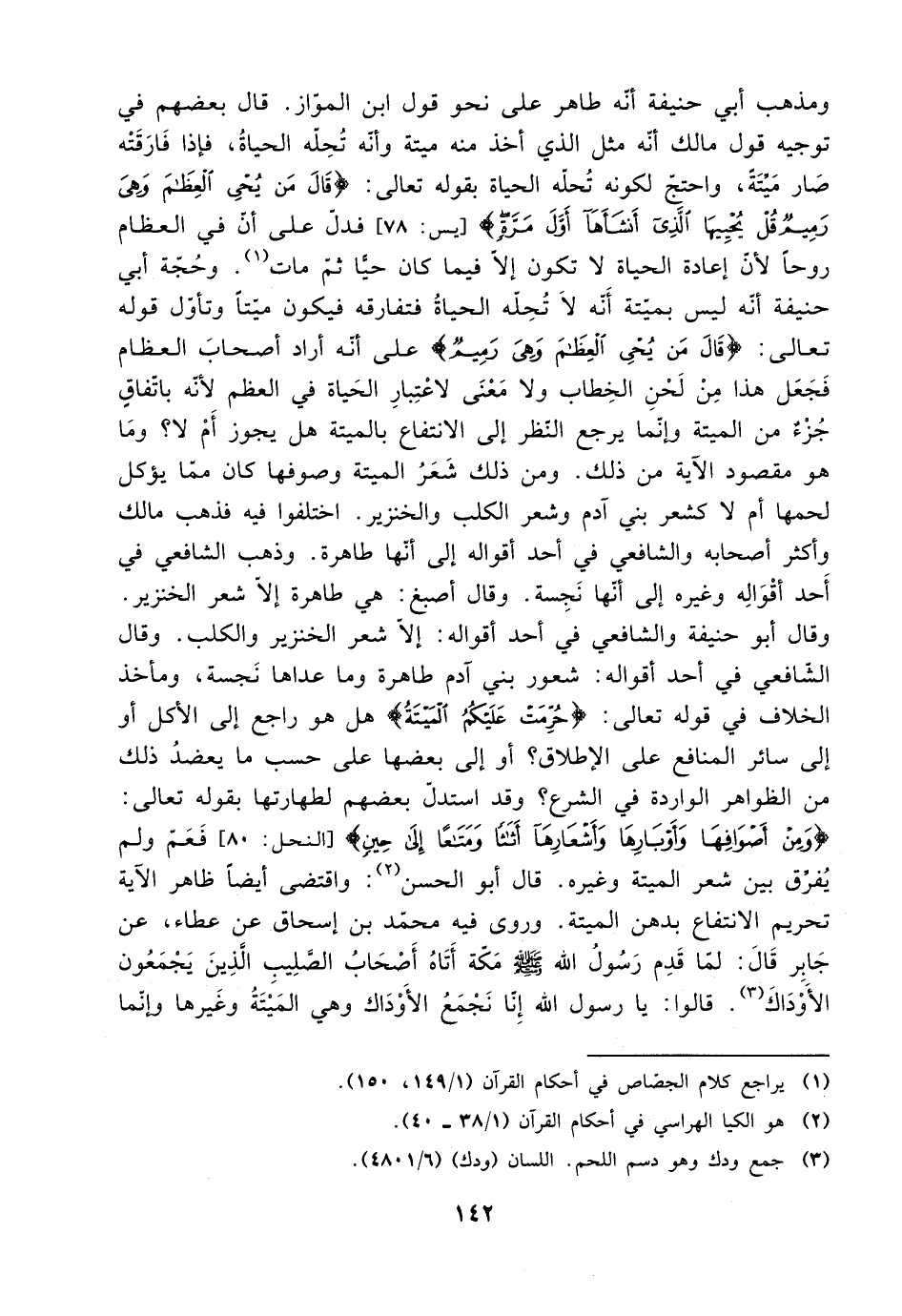 ومذهب أبي حنيفة أنه طاهر على نحو قول ابن المواز. قال بعضهم في توجيه قول مالك أنه مثل الذي أخذ منه ميتة، وأنه تحله الحياة، فإذا فارقته صار ميتة، واحتج لكونه تحله الحياة بقوله تعالى: {قال من يحيي العظام وهي رميم قل يحييها الذي أنشأها أول مرة} [يس: 78]، فدل على أن في العظام روحًا؛ لأن إعادة الحياة لا تكون إلا فيما كان حيًا ثم مات. وحجة أبي حنيفة أنه ليس بميتة أنه لا تحله الحياة فتفارقه، فيكون ميتًا، وتأول قوله تعالى: {قال من يحيي العظام وهي رميم)) على أنه أراد أصحاب العظام فجعل هذا من لحن الخطاب، ولا معنى لاعتبار الحياة في العظم لأنه باتفاق جزء من الميتة، وإنما يرجع النظر إلى الانتفاع بالميتة هل يجوز أم لا؟ وما مقصود الآية من ذلك. ومن ذلك شعر الميتة وصوفها كان مما يؤكل لحمها أم لا كشعر بني آدم وشعر الكلب والخنزير. اختلفوا فيه فذهب مالك وأكثر أصحابه والشافعي في أحد أقواله وغيره إلى أنها نجسة. وقال أصبغ: هي طاهرة إلا شعر الحنزير. وقال أبو حنيفة والشافعي في أحد أقواله: شعور بني آدم طاهرة، وما عداه نجسة، ومأحذ الخلاف في قوله تعالى: {حرمت عليكم الميتة} هل هو راجع إلى الأكل أو إلى سائر المنافع على الإطلاق؟ أو إلى بعضها على حسب ما يعضد ذلك من الظواهر الواردة في الشرع؟ وقد استدل بعضهم لطهارتها بقوله تعالى: {ومن أصوافها وأوبارها وأشعارها أثاثًا ومتاعًا إلى حين} [النحل: 80] فعم ولم يفرق بين شعر الميتة وغيره. قال أبو الحسن: واقتضى أيضًا ظاهر الأية تحريم الانتفاع بدهن الميتة. وروى فيه محمد بن إسحاق عن عطاء، عن جابر قال: لما قدم رسول الله صلى الله عليه وسلم مكة أتاه أصحاب الصليب الذين يجمعون الأوداك. قالوا: يا رسول الله إنا نجمع الأوداك وهي الميتة وغيرها وإنما