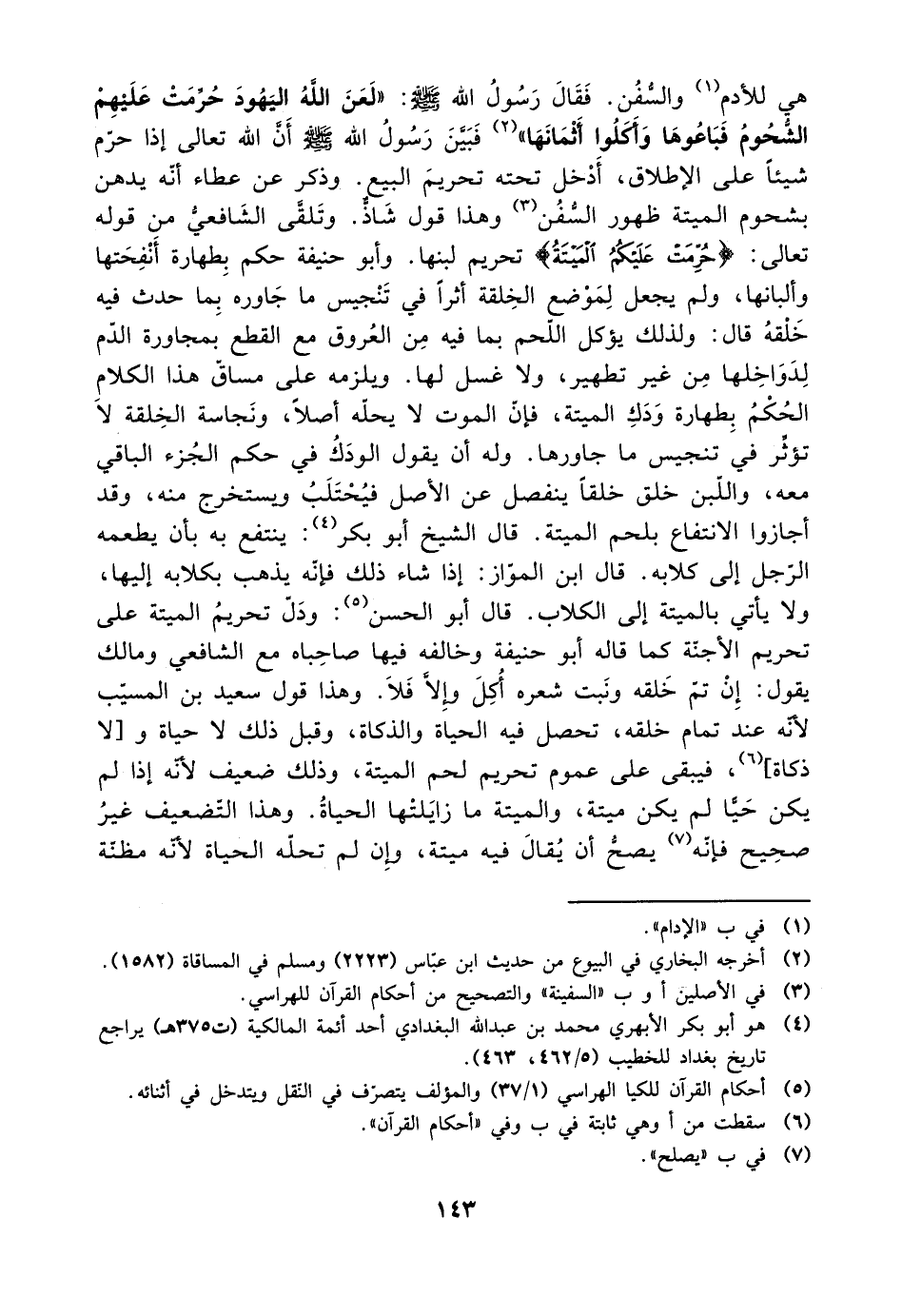 هي للأدم والسفن. فقال رسول الله صلى الله عليه وسلم: ((لعن الله اليهود حرمت عليهم الشحوم فباعوها وأكلوا أثمانها)) فبين رسول الله صلى الله عليه وسلم أن الله تعالى إذا حرم شيئًا على الإطلاق، أدخل تحته تحريم البيع. وذكر عن عطاء أنه يدهن بشحوم الميتة ظهور السفن، وهذا قول شاذ. وتلقى الشافعي من قوله تعالى: {حرمت عليكم الميتة} تحريم لبنها. وأبو حنيفة حكم بطهارة أنفحتها وألبانها، ولم يجعل لموضع الخلقة أثرًا في تنجيس ما جاوره بما حدث فيه خلقه قال: ولذلك يؤكل اللحم بما فيه من العروق مع القطع بمجاورة الدم لدواخلها من غير تطهير، لا غسل لها. ويلزمه على مساق هذا الكلام الحكم بطهارة ودك الميتة، فإن الموت لا يحله أصلًا، ونجاسة الخلقة لا تؤثر في تنجيس ما جاورها. وله أن يقول الودك في حكم الجزء الباقي معه، واللبن خلق خلقًا ينفصل عن الأصل فيحتلب ويستخرج منه، وقد أجازوا الانتفاع بلحم الميتة. قال الشيخ أبو بكر: ينتفع به بأن يطعمه الرجل إلى كلابه. قال ابن المواز: إذا شاء ذلك فإنه يذهب بكلابه إليها، ولا يأتي بالميتة إلى الكلاب. قال أبو الحسن: ودل تحريم الميتة على تحريم الأجنة كما قال أبو حنيفة وخالفه فيها صاحباه مع الشافعي، ومالك يقول: إن تم خلقه ونبت شعره أكل وإلا فلا. وهذا قول سعيد بن المسيب لأنه عند تمام خلقه، تحصل فيه الحياة والذكاة، قبل ذلك لا حياة و [لا ذكاة]، فيبقى على عموم تحريم لحم الميتة، وذلك ضعيف لأنه إذا لم يكن حيًا لم يكن ميتة، والميتة ما زايلتها الحياة. وهذا التضعيف غير صحيح فإنه يصح أن يقال فيه ميتة، وإن لم تحله الحياة لأنه مظنة