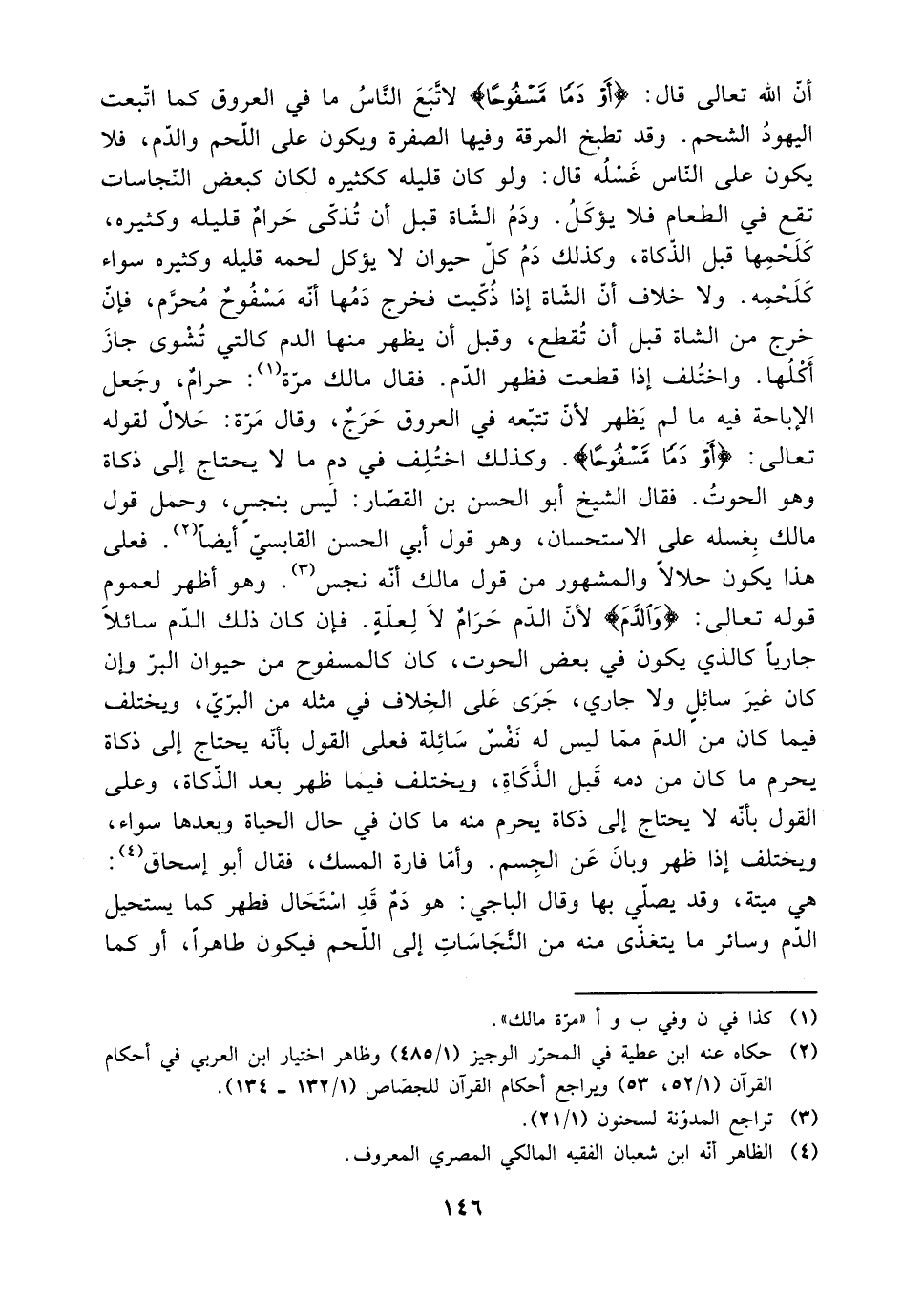 أن الله تعالى قال: {أو دمًا مسفوحًا} لاتبع الناس ما في العروق كما اتبعت اليهود الشحم. وقد تطبخ المرقة وفيها الصفرة ويكون على اللحم والدم، فلا تقع في الطعام فلا يؤكل. ودم الشاة قبل أن تذكى حرام قليله وكثيره، كلحمها قبل الذكاة، وكذلك دم كل حيوان لا يؤكل لحمه قليله وكثيره سواء كلحمه. ولا خلاف أن الشاة إذا ذكيت فخرج دمها أنه مسفوح محرم، فإن خرج من الشاة قبل أن تقطع، وقبل أن يظهر منها الدم كالتي تشوى جاز أكلها. واختلف إذا قطعت فظهر لدم. فقال مالك مرة: حرام، وجعل الإباحة فيه مل لم يظهر لأن تتبعه في العروق حرج، وقال مرة: حلال لقوله تعالى: {أو دمًا مسفوحًا} وكذلك اختلف في دم ما لا يحتاج إلى ذكاة وهو الحوت. فقال الشيخ أبو الحسن القصار: ليس بنجس، وحمل قول مالك بغسله على الاستحسان، وهو قول أبي الحسن القابسي أيضًا. فعلى هذا يكون حلالًا، والمشهور من قول مالك أنه نجس. وهو أظهر لعموم قوله تعالى: {والدم} لأن الدم حرام لا لعلة. فإن كان ذلك الدم سائلًا جاريًا كالذي يكون في بعض الحوت، كان كالمسفوح من حيوان البر، وإن كان غير سائل ولا جاري، جرى على الخلاف في مثله من البري، ويختلف فيما كان من الدم مما ليس له نفس سائلة، فعلى القول بأنه يحتاج إلى ذكاة يحرم ما كان من دمه قبل الذكاة، ويختلف فيما ظهر بعد الذكاة، وعلى القول بأنه لا يحتاج إلى ذكاة يحرم منه ما كان في حال الحياة، فقال أبو إسحاق: هي ميتة، وقد يصلي بها، وقال الباجي: هو دم قد استحال فطهر كما يستحيل الدم وسائر ما يتغذى منه من النجاسات إلى اللحم فيكون طاهرًا، أو كما