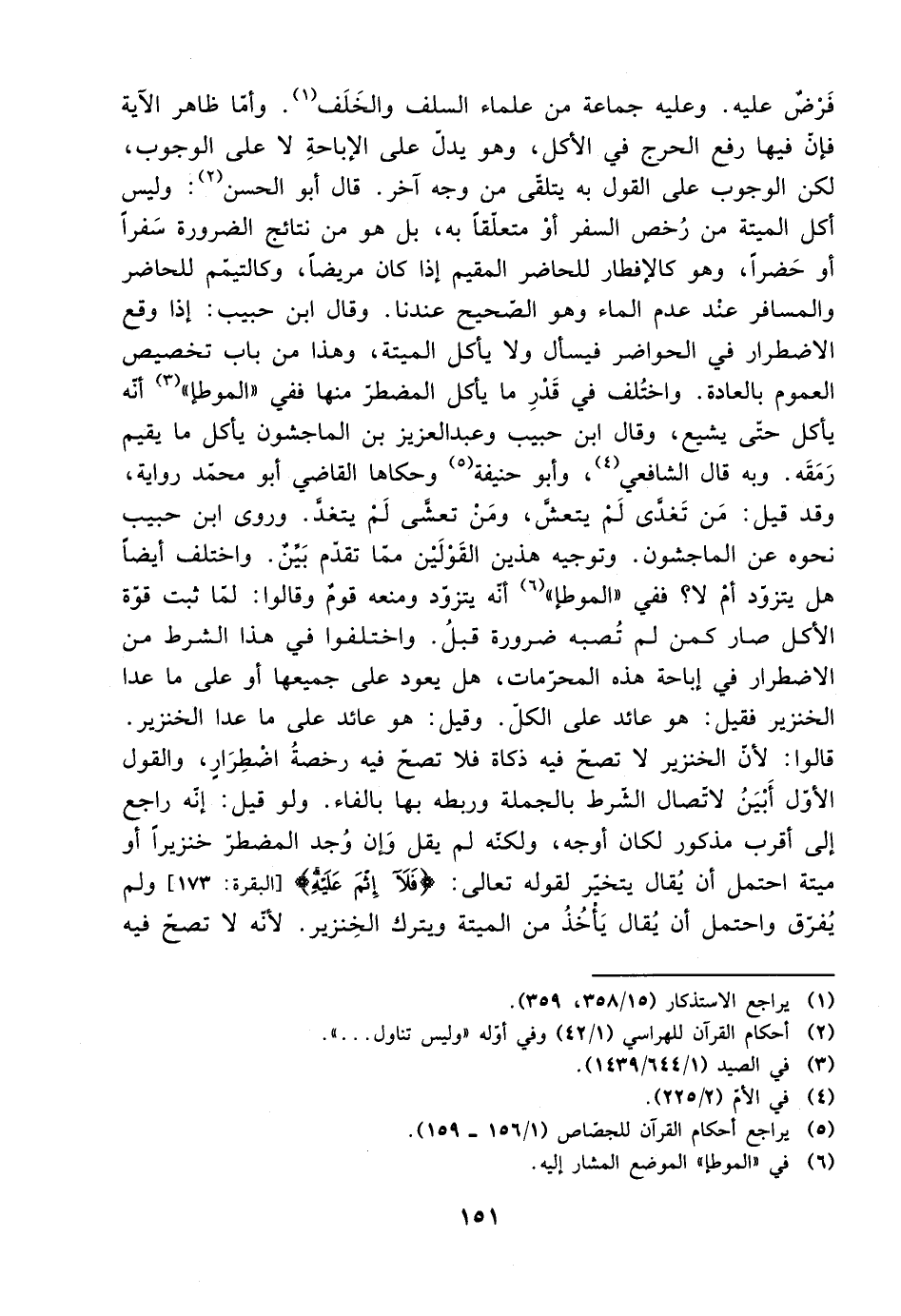 فرض عليه، عليه جماعة من علماء السلف والخلف. وأما ظاهر الآية فإن فيها رفع الحرج في الأكل، وهو يدل على الإباحة لا على الوجوب، لكن الوجوب على القول به يتلقى من وجه آخر. قال أبو الحسن: ليس أكل الميتة من رخص السفر أو متعلقًا به، بل هو من نتائج الضرورة سفرًا أو حضرًا، وهو كالإفطار للحاضر المقيم إذا كان مريضًا، كالتيمم للحاضر والمسافر عند عدم الماء وهو الصحيح عندنا. وقال ابن حبيب: إذا وقع الاضطرار في الحواضر فيسأل ولا يأكل الميتة، وهذا من باب تخصيص العموم بالعادة. واختلف في قدر ما يأكل المضطر منها؛ ففي ((الموطأ)) أنه يأكل حتى يشبع، وقال ابن حبيب وعبد العزيز بن الماجشون: يأكل ما يقيم رمقه. وبه قال الشافعي، وأبو حنيفة، وحكاها القاضي أبو محمد رواية، وقد قيل: من تغدى لم يتعش، ومن تعشى لم يتغد. وروى ابن حبيب نحوه عن الماجشون. وتوجيه هذين القولين مما تقدم بين. واختلف في هذا الشرط من الاضطرار في إباحة هذه المحرمات، هل يعود على جميعها أو على ماعدا الخنزير، فقيل: هو عائد على الكل. وقيل: هو عائد على ما عدا الخنزير.