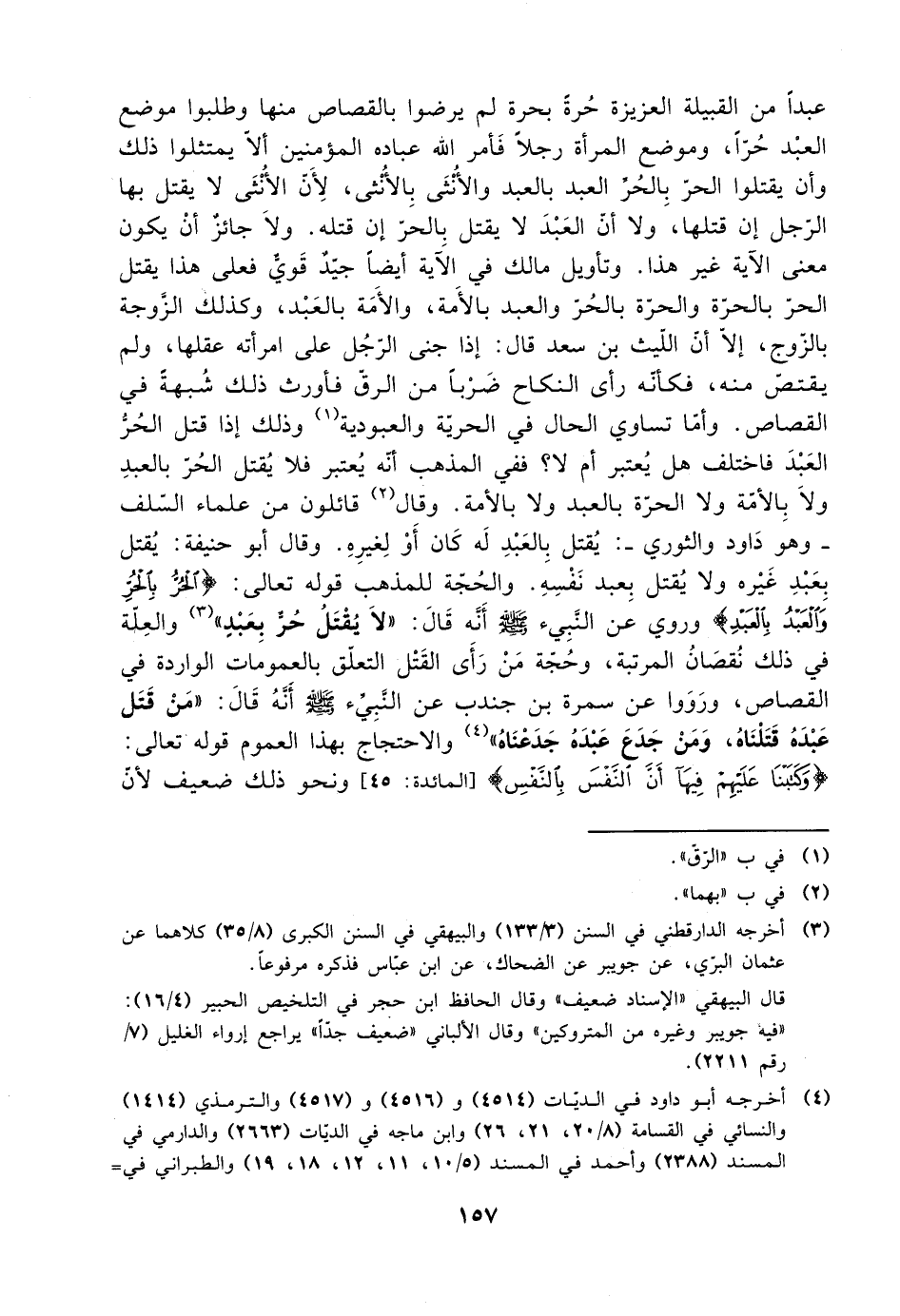 عبدًا من القبيلة العزيزة حرة بحرة لم يرضوا بالقصاص منها وطلبوا موضع العبد حرًا، وموضع المرأة رجلًا فأمر الله عباده المؤمنين ألا يمتثلوا ذلك وأن يقتلوا الحر بالحر والعبد بالعبد والأنثى باانثى، لأن الأنثى لا يقتل بها الرجل إن قتلها، ولا أن العبد لا يقتل الحر إن قتله. ولا جائز أن يكون معنى الآية غير هذا. وتأويل مالك في الآية أيضًا جيد قوي، فعلى هذا يقتل الحر بالحر والحرة بالحرة والعبد بالأمة، والأمة بالعبد، وكذلك الزوجة بالزوج، إلا أن الليث بن سعد قال: إذا جنى الرجل على امرأته عقلها، ولم يقتص منه، فكأنه رأى النكاح ضربًا من الرق فأورث ذلك شبهة في القصاص. وأما تساوي الحال في الحرية والعبودية وذلك إذا قتل الحر العبد فاختلف هل يعتبر أم لا؟ ففي المذهب أنه يعتبر فلا يقتل الحر بالعبد ولا الأمة ولا الحرة بالعبد ولا بالأمة. وقال قائلون من علماء السلف -وهو داود والثوري-: يقتل بالعبد له كان أو لغيره. وقال أبو حنيفة: يقتل بعبد غيره ولا يقتل بعبد نفسه. والحجة للمذهب لقوله تعالى: {الحر بالحر والعبد بالعبد} وروي عن النبي صلى الله عليه وسلم أنه قال: ((لا يقتل حر بعبد)) والعلة في ذلك نقصان المرتبة، وحجة من رأى القتل التعلق بالعمومات الواردة في القصاص، ورووا عن سمرة بن جندب عن النبي صلى الله عليه وسلم أنه قال: ((من قتل عبدًا قتلناه، ومن جدع عبدًا جدعناه)) والاحتجاج بهذا العموم قوله تعالى: {وكتبنا عليهم فيها أن النفس بالنفس} [المائدة: 45] ونحو ذلك ضعيف لأن