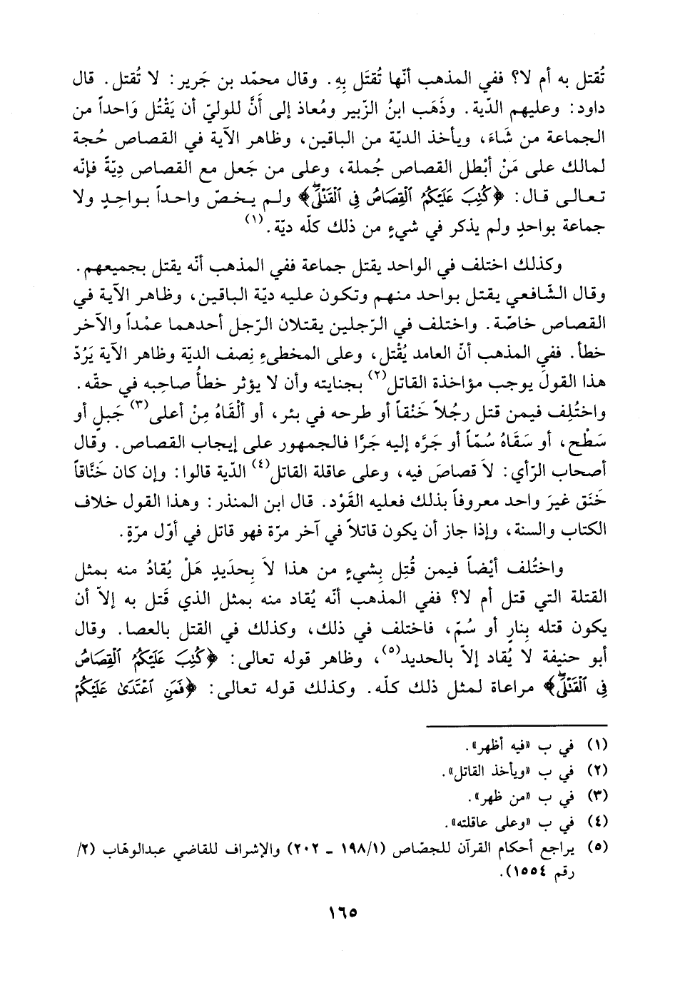 وكذلك اختلف في الواحد يقتل جماعة ففي المذهب أنه يقتل بجميعهم. وقال الشافعي يقتل بواحد منهم وتكون عليه دية الباقين، وظاهر الآية في القصاص خاصة. واختلف في الرجلين يقتلان الرجل أحدهما عمدًا والآخر خطأ. ففي المذهب أن العامد يقتل، وعلى المخطئ نصف الدية وظاهر الآية يرد هذا القول يوجب مؤاخذة القاتل بجنايته وأن لا يؤثر خطأ صاحبه في حقه.
