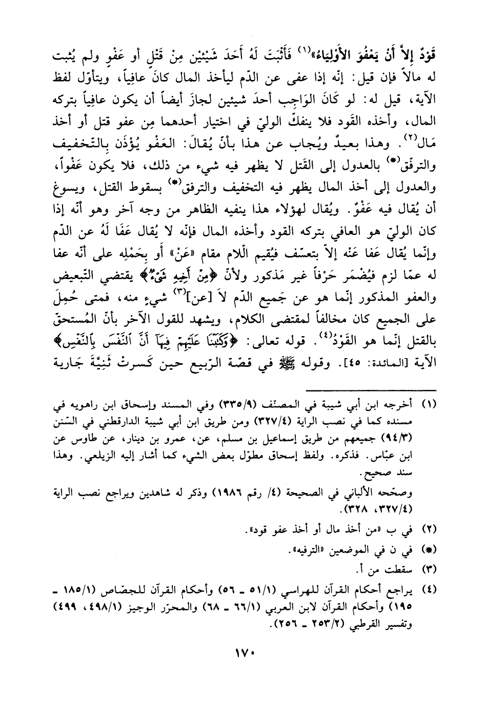 قود إلا أن يعفو الأولياء)) فأثبت له أحد شيئين من قتل أو عفو ولم يثبت له مالًا فإن قيل: إنه عفي عن الدم ليأخذ المال كان عافيًا، ويتأول لفظ الآية، قيل له: لو كان الواجب أحد شيئين لجاز أيضًا أن يكون عافيًا بتركه المال، وأخذه القود فلا ينفك الولي في اختيار أحدهما من عفو قتل أو أخذ مال. وهذا بعيد ويجاب عن هذا بأن يقال: العفو يؤذن بالتخفيف والترفق بالعدول إلى القتل لا يظهر فيه شيء من ذلك، فلا يكون عفوًا، والعدول إلى أخذ المال يظهر فيه التخفيف والترفق بسقوط القتل، ويسوغ أن يقال فيه عفو. ويقال لهؤلاء هذا ينفيه الظاهر من وجه آخر وهو أنه إذا كان الواي هو العافي بتركه القود وأخذه المال فإنه لا يقال عفا له عن الدم وإنما يقال عفا عنه إلا بتعسف فيقيم اللام مقام ((عن)) أو بحمله على أنه عفا له عما لزم فيضر حرفًا غري مذكور ولأن {من أخيه شيء} يقتضي التبعيض والعفو المذكور إنما هو عن جميع الدم لا [عن] شيء منه، فمتى حمل على الجميع كان مخالفًا لمقتضى الكلام، ويشهد للقول الآخر بأن المستحق بالقتل إنما هو القود. قوله تعالى: {وكتبنا عليهم فيها أن النفس بالنفس} الآية [المائدة: 45]. وقوله صلى الله عليه وسلم في قصة الربيع حين كسرت ثنية جارية