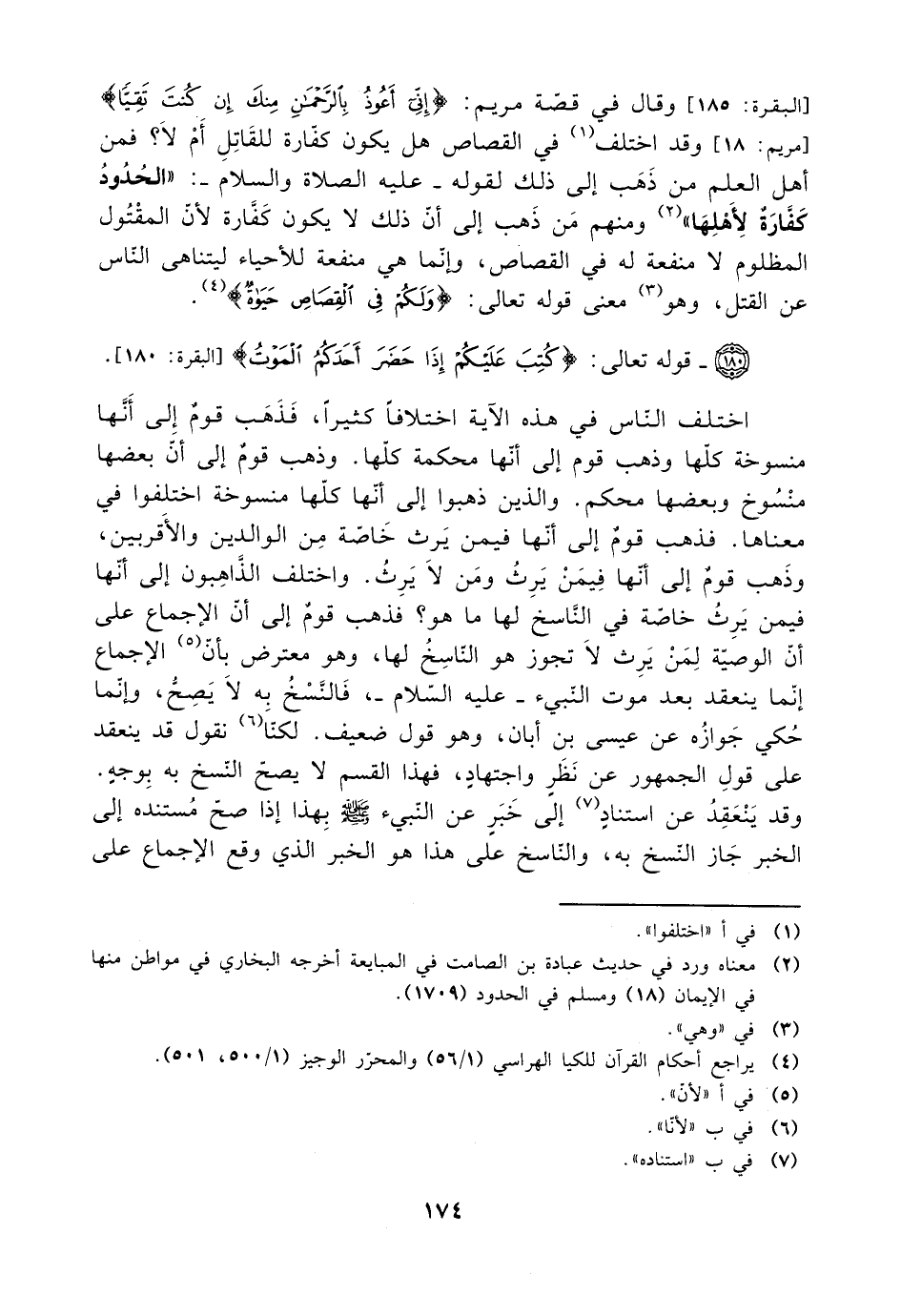 اختلف الناس في هذه الآية اختلافًا كثيرًا، فذهب قوم إلى أنها منسوخة كلها وذهب قوم إلى أنها محكمة كلها. وذهب قوم إلى أن بعضها منسوخ وبعضها محكم. والذين ذهبوا إلى أنها كلها منسوخة اختلفوا في معناها. فذهب قوم إلى أنها فيمن يرث ومن لا يرث. واختلف الذاهبون إلى أنها فيمن يرث خاصة في الناسخ لها ما هو؟ فذهب قوم إلى أن الإجماع على أن الوصية لمن يرث لا تجوز هو الناسخ لها، وهو معترض بأن الإجماع إنما ينعقد بعد موت النبي -عليه السلام-، فالنسخ به لا يصح، وإنما حكي جوازه عن عيسى بن أبان، وهو قول ضعيف. لكنا نقول قد ينعقد على قول الجمهور عن نظر واجتهاد، فهذا القسم لا يصح النسخ به بوجه.