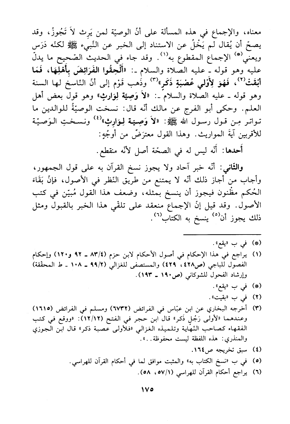 معناه، والإجماع في هذه المسألة على أن الوصية لمن يرث لا تجوز، وقد يصح أن يقال أن لم يخل عن الاستناد إلى الخبر عن النبي صلى الله عليه وسلم لكنه درس، ويعني الأجماع المقطوع به. وقد جاء في الحديث الصحيح ما يدل عليه وهو قوله -عليه الصلاة والسلام-: ((ألحقوا الفرائض بأهلها، فما أبقت، فهو لأولى عصبة ذكر)) وذهب قوم إلى أن الناسخ لها السنة، وهو قوله -عليه الصلاة والسلام-: ((لا وصية لوارث)) وهو قول بعض أهل العلم. وحكى أبو الفرج عن مالك أنه قال: نسخت الوصية للوالدين ما تواتر من قول رسول الله صلى الله عليه وسلم: ((لا وصية لوارث)) ونسخت الوصية للأقربين آية المواريث. وهذا القول معترض من أوجه: