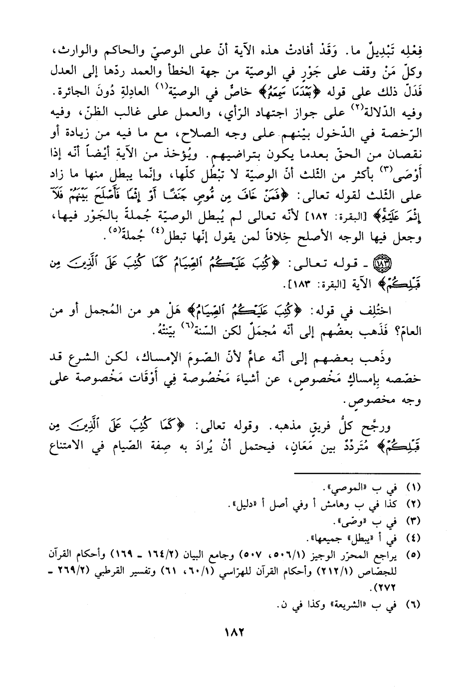 وفيه الدلالة على جواز اجتهاد الرأي، والعمل على غالب الظن، وفيه الرخصة في الدخول بينهم على وجه الصلاح، مع ما فيه من زيادة أو نقصان من الحق بعدما يكون بتراضيهم. ويؤخذ من الآية أيضًا أنه إذا أوصى بأكثر من الثلث أن الوصية لا تبطل كلها، وإنما يبطل منها ما زاد على الثلث لقوله تعالى: {فمن خاف من موص جنفًا أو إثمًا فأصلح بينهم فلا إثم عليه} [البقرة: 182] لأنه تعالى لم يبطل الوصية جملة بالجور فيها، وجعل فيها الوجه الأصلح خلافًا لمن يقول إنها تبطل جملة.