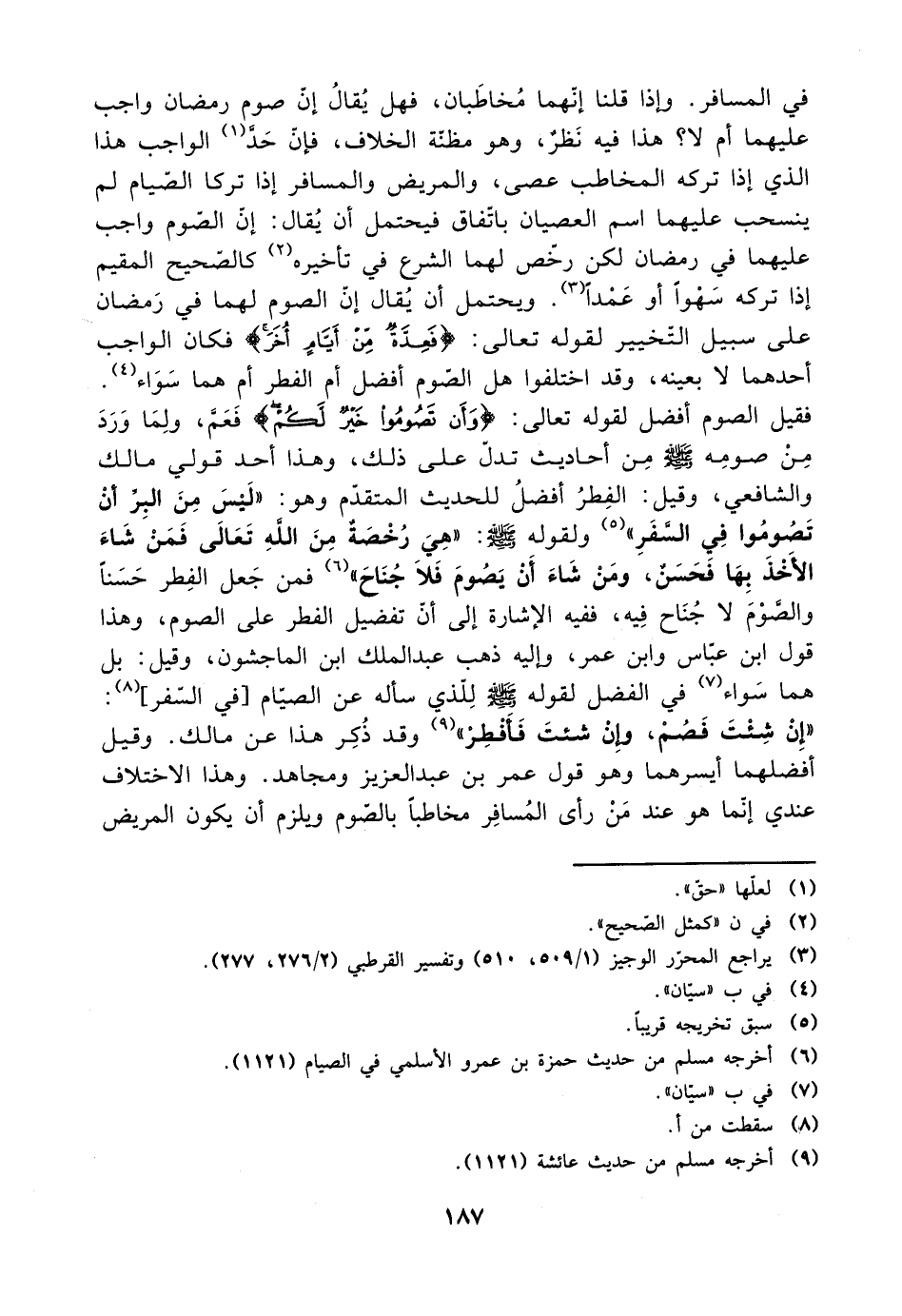 في المسافر. وإذا قلنا أنهما مخاطبان، فهل يقال إن صوم رمضان واجب عليهم أم لا؟ هذا فيه نظر، وهو مظنة الخلاف، فإن حد الواجب هذا الذي إذا تركه المخاطب عصى، والمريض والمسافر إذا تركا الصيام لم ينسحب عليهما اسم العصيان باتفاق فيحتمل أن يقال: إن الصوم واجب عليهما في رمضان لكن رخص لهما الشرع في تأخيره كالصحيح المقيم إذا تركه سهوًا أو عمدًا. ويحتمل أن يقال إن الصوم لهما في رمضان على سبيل التخيير لقوله تعالى: {فعدة من أيام أخر} فكان الواجب أحدهما لا بعينه، وقد اختلفوا هل الصوم أفضل أم الفطر أم هما سواء.