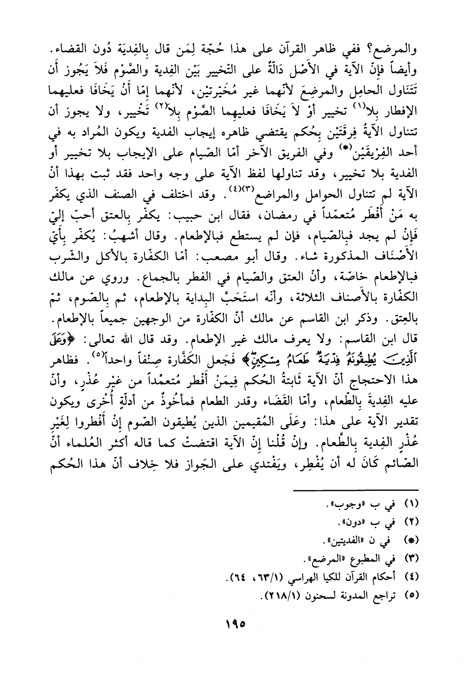 وأيضًا فإن الآية في الأصل دالة على التخيير بين الفدية والصوم فلا يجوز أن تتناول الحامل والمرضع لأنهما غير مخيرتين، لأنهما إما أن يخافا فعليهما الإفطار بلا تخيير أو لا يخافا فعليهما الصوم بلا تخيير، ولا يجوز أن تتناول الآية فرقتين بحكم يقتضي ظاهره إيجاب الفدية ويكون المراد به في أحد الفريقين وفي الفريق الآخر أما الصيام على الإيجاب بلا تخيير أو الفدية بلا تخيير، وقد تناولها لفظ الآية على وجه واحد فقد ثبت بهذا أن الآية تتناول الحوامل والمرضع. وقد اختلف في الصنف الذي يكفر به من أفطر متعمدًا في رمضان، فقال ابن حبيب: يكفر بالعتق أحب إليّ فإن لم يجد فبالصيام، فإن لم يستطع فبالإطعام. وقال أشهب: يكفر بأي الأصناف المذكورة شاء. وقال أبو مصعب: أما الكفارة بالأكل والشرب فبالإطعام خاصة، وأن العتق والصيام في الفطر بالجماع. وروي عن مالك الكفارة بالأصناف الثلاثة، وأنه استحب البداية بالإطعام، ثم بالصوم، ثم بالعتق. وذكر ابن القاسم عن مالك أن الكفارة من الوجهين جميعًا بالإطعام.