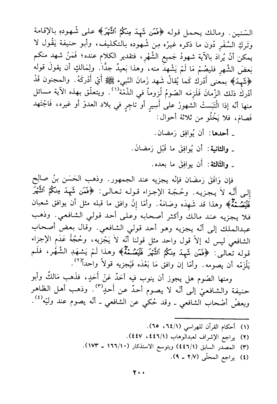 السنين. ومالك يحمل قوله {فمن شهد منكم الشهر} على شهوده بالإقامة وترك السفر دون ذكر ما ذكره غيره من شهوده بالتكليف، وأبو حنيفة يقول لا يمكن أن يراد بالآية شهود جميع الشهر، فتقدير الكلام عنده؛ فمن شهد منكم بعض الشهر فليصم ما لم يشهد منه، وهذا بعيد جدًا. ولمالك أن قيول قوله {شهد} بمعنى أدرك ذلك الزمان فلزمه الصوم لزومًا في الذمة. ويتعلق بهذه الآية مسائل منها أنه إذا التبست الشهور على أسير أن تاجر في بلاد العدو أو غيره، فاجتهد فصام، فلا يخلو من ثلاثة أحوال: