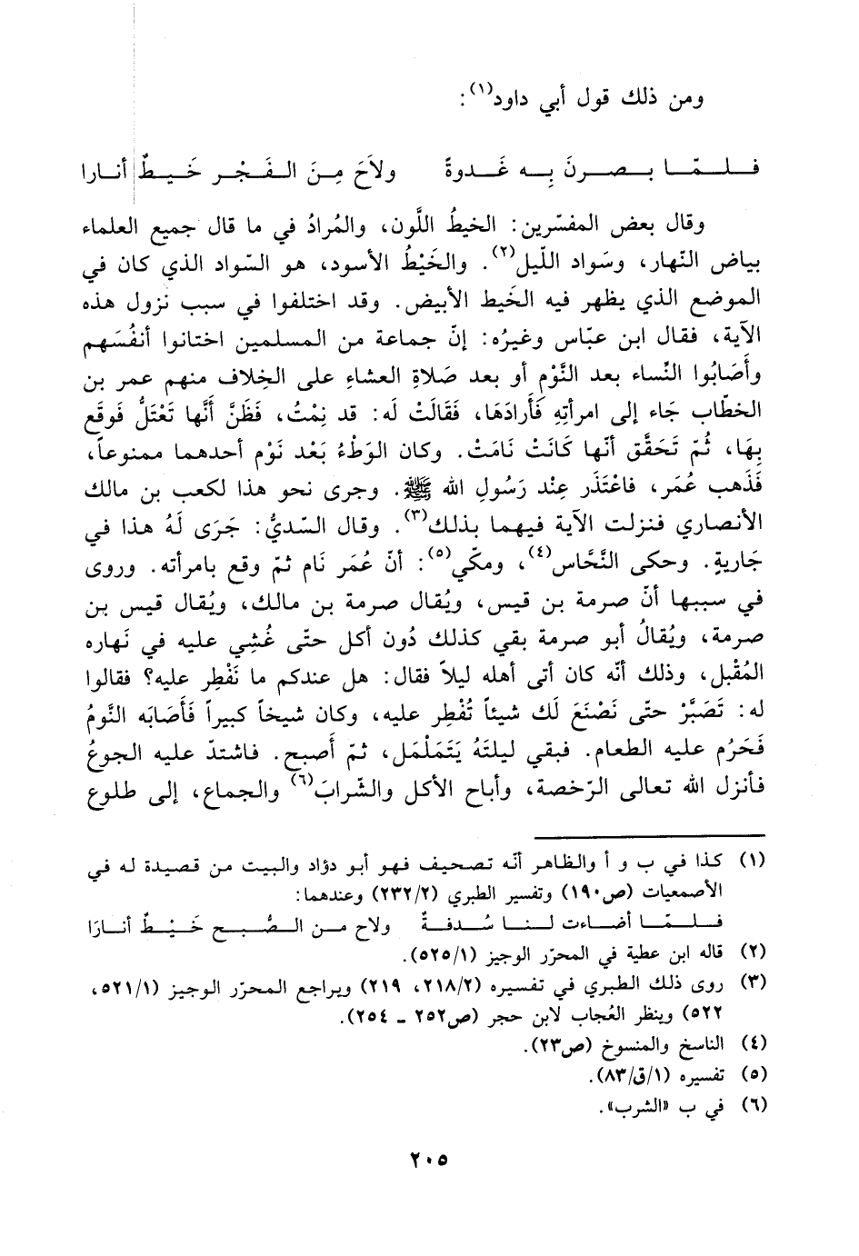 وقال بعض المفسرين: الخيط اللون، والمراد في ما قال جميع العلماء بياض النهار، وسواد الليل. والخيط الأسود، هو السواد الذي كان في الموضع الذي يظهر فيه الخيط الأبيض. وقد اختلفوا في سبب نزول هذه الآية، فقال ابن عباس ويره: إن جماعة من المسلمين اختانوا أنفسهم وأصابوا النساء بعد النوم أو بعد العشاء على الخلاف منهم عمر بن الخطاب جاء ارمأته فأرادها، فقالت له: قد نمتُ، فظن أنها تعتل فوقع بها، ثم تحقق أنها كانت نامت. وكان الوطء بعد نوم أحدهما ممنوعًا، فذهب عمر، فاعتذر عند رسول الله صلى الله عليه وسلم. وجرى نحو هذا لكعب بن مالك الأنصاري فنزلت الآية فيهما بذلك. وقال السدي: جرى له هذا في جارية. وحكى النحاس، ومكي: أن عمر ناك ثم وقع بامرأته. وروى في سببها أن صرمة بن قيس، ويقال صرمة بن مالك، ويقال قيس بن صرمة، ويقال أبو صرمة بقي كذلك دون اكل حتى غشي عليه في نهاره المقبل، وذلك أنه كان أتى أهله ليلًا فقال: هل عندكم ما نفطر عليه؟ فقالوا له: تصبر حتى نصنع لك شيئًا تفطر عليه، وكان شيخًا كبيرًا فأصابه الجوع فحرم عليه الطعام. فبقي ليلته يتململ، ثم أصبح. فاشتد عليه الجوع فأنزل الله تالى الرخصة، وأباح الأكل والشراب والجماع، إلى طلوع