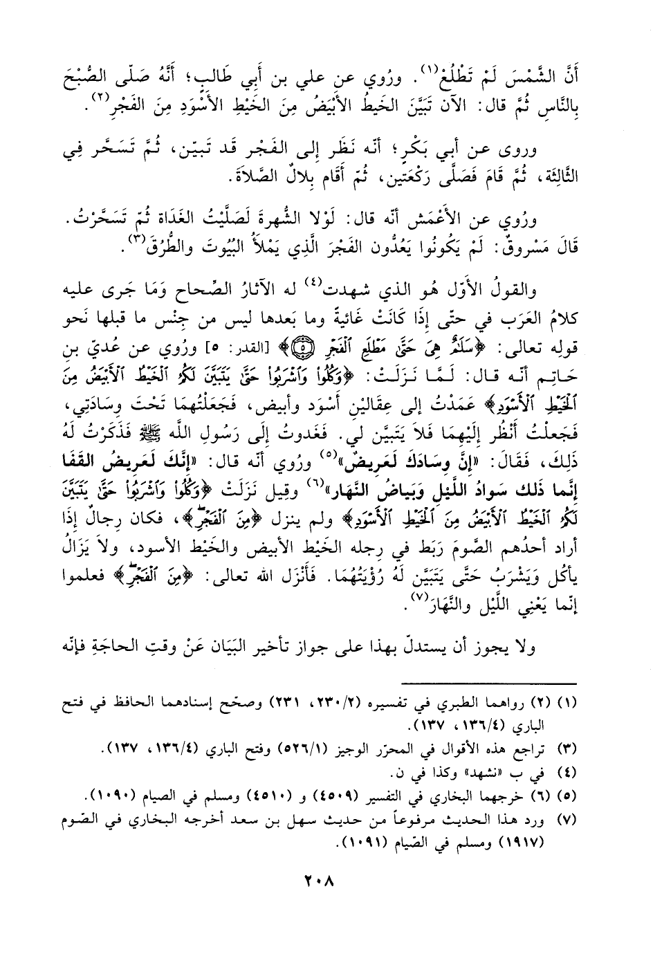 أن الشمس لم تطلع. وروي عن علي بن أبي طالب؛ أنه صلى الصبح بالناس ثم قال: الآن تبين الخيط الأبيض من الخيط الأسود من الفجر.