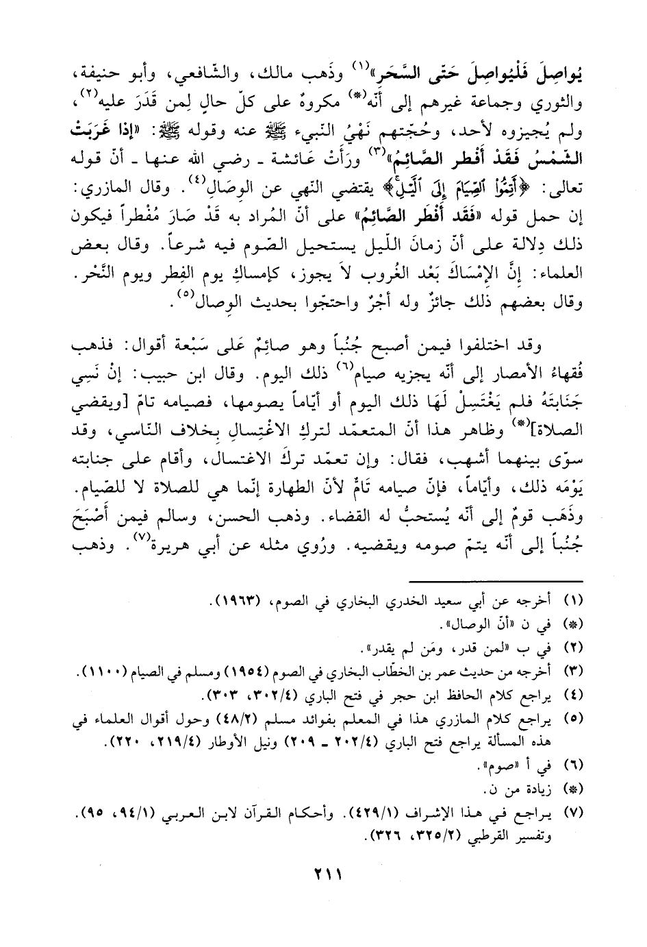 يواصل فليواصل حتى السحر)) وذهب مالك، والشافعي، وأبو حنيفة، والثوري؟ وجماعة غريهم إلى أنه مكروه على كل حال لمن قدر عليه، ولم يجيزوه لأحد، وحجتهم نهي النبي صلى الله عليه وسلم عنه قوله صلى الله عليه وسلم: ((إذا غربت الشمس فقد أفطر الصائم)) ورأت عائشة -رضي الله عنها- أن قوله تعالى: {أتموا الصيام إلى الليل} يقتضي النهي عن الوصال. وقال المازري: إن حمل قوله ((فقد أفطر الصائم)) على أن المراد به صار مفطرًا فيكون دلالة على أن زمان الليل يستحيل الصوم فيه شرعًا. وقال بعض العلماء: إن الإمساك بعد الغروب لا يجوز، كإمساك يوك الفطر ويوم النحر.