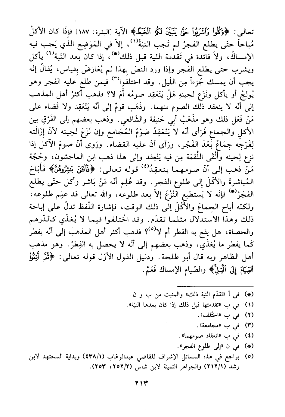 تعالى: {وكلوا اشربوا حتى يتبين لكم الخيط} الآية [البقرة: 187] فإذا كان الأكل مباحًا حتى يطلع الفجر لم تجب النية، إلا في الموضع الذي يجب فيه الإمساك، ولا فائدة في تقدمة النية قبل ذلك، إذا كان بعدج النية يأكل ويشرب حتى يطلع الفجر وإذا ورد النص بهذا لم يعارض بقياس، يقال إنه يجب أن يمسك جزءًا من الليل. وقد اختلفوا فيمن طلع عليه الفجر وهو يولج أو يأكل ونزع لحينه هل ينعقد ثومه أم لا؟ فذهب أكثر أهل المذهب إلى أنه لا ينعقد ذلك الصوم منهما. وذهب قوم إلى أنه ينعقد ولا قضاء على من فعل ذلك وهو مذهب أبي حنيفة والشافعي. وذهب بعضهم إلى الفرق بين الأكل والجماع فرأى أنه لا ينعقد صوم المجامع وإن نزع لحينه لأن إزالته لفرجه جماع بعد الفجر، ورأى أن عليه القضاء. وروى أن صوم الأكل إذا نزع لحينه وألقى اللقمة من فيه ينعقد وإلى هذا ذهب ابن الماجشون، وحجة من ذهب إلى أن صومهما ينعقد قوله تعالى: {فالآن باشروهن} فأباح المباشرة والأكل إلى طلوع الفجر. وقد علم أنه من باشر وأكل حتى يطلع الفجر فإنه لا يستطيع النزع إلا بعد طلوعه، ,الله تعالى قد علم طلوعه، ولكنه أباح الجماع والأكل إلى ذلك الوقت، فإشارة اللفظ تدل على إباحة ذلك وهذا الاستدلال مثلما تقدم. وقد اختلفوا فيما لا يغذي كالدرهم والحصاة، هل يقع به الفطر أم لا. فذهب أكثر أهل المذهب إلى أنه يفطر كما يفطر ما يغذي، وذهب بعضهم إلى انه لا يحصل به الفطر. وهو مذهب أهل الظاهر وبه قال أبو طلحة. ودليل القوم الأول قوله تعالى: {ثم أتموا الصيام إلى الليل} والصيام الإمساك فعم.