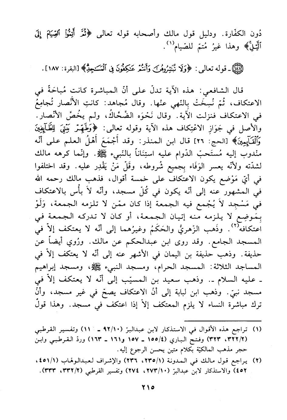 والأصل في جواز الاعتكاف هذه الآية وقوله تعالى: {وطهر بيتي للطائفين والقائمين} [الحج: 26] قال ابن المنذر: وقد أجمع أهل العلم على أنه مندوب إليه مستحب الدوام عليه استنانًا بالنبي صلى الله عليه وسلم. وإنما كرهه مالك لشدته ولأنه يعسر الوفاء بجميع شروطه، وقل من يقدر عليه. وقد اختلفوا في أي موضع يكون الاعتكاف على خمسة أقوال، فذهب مالك رحمه الله في المشهور عنه إلى أنه يكون في كل مسجد، وأنه لا بأس بالاعتكاف في مسجد لا يجمع فيه الجمعة إذا كان ممن لا تلزمه الجمعة، ولو بموضع لا يلزمه منه إتيان الجمعة، أو كان لا تدركه الجمعة في اعتكافه. وذهب الزهري والحكم وغيرهما إلى أنه لا يعتكف إلا في حذيفة. وذهب حذيفة بن اليمان في الأشهر عنه إلى أنه لا يعنكف إلا في المساجد الثلاثة: المسجد الحرام، ومسجد النبي صلى الله عليه وسلم، ومسجد إبراهيم -عليه السلام-. وذهب سعيد بن المسيب إلى أنه لا يعتكف إلا في مسجد نبي. وذهب ابن لبابة إلى أن الاعتكاف يصح في غير مسجد، وأن ترك مباشرة النساء لا يلزم المعتكف إلا إذا اعتكف في مسجد. وهذا قول