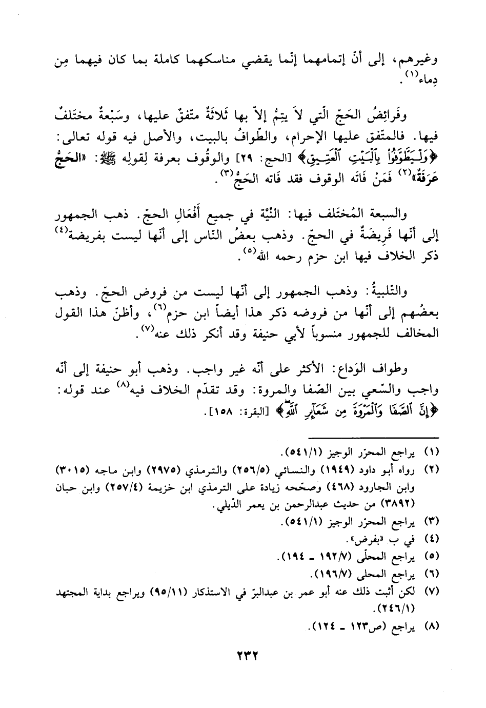 والسبعة المختلف فيها: النية في جميع أفعال الحج. وذهب اجمهور إلى أنها فريضة في الحج. وذهب بعض الناس إلى أنها ليست بفريضة ذكر الخلاف فيها ابن حزم رحمه الله.