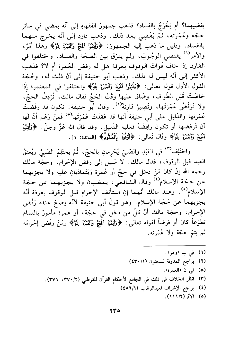 يقضيهما؟ أم يخرج بالفساد؟ فذهب جمهور الفقهاء إلى أنه يمضي في سائر حجه وعمرته، ثم يقضي بعد ذلك. وذهب داود إلى أنه يخرج منهما بالفساد. ودليل ما ذهب إليه الجمهور: {وأتموا الحج والعمرة لله} وهذا أمر، والأمر يقتضي الوجوب، ولم يفرق بين الصحة والفساد. واختلفوا في القارن إذا خاف فوات الوقوف بعرفة هل له رفض العمرة أم لا؟ فذهب الأكثر إلى أنه ليس له ذلك. وذهب أبو حنيفة إلى أن ذلك له، وحجة القول الأول قوله تعالى: {وأتموا الحج والعمرة لله} واختلفوا في المعتمرة إذا حاضت قبل الطواف، وضاق عليها وقت الحج فقال مالك، تردف الحج، ولا ترفض عمرتها، وتصير قارنة. وقال أبو حنيفة: تكون قد رفضت عمرتها والدليل على أبي حنيفة أنها قد عقدت عمرتها فمن زعم أن لها أن ترفضها أو تكون رافضة فعليه الدليل. وقد قال الله عز وجل: {وأتموا الحج والعمرة لله} وقال تعالى: {أوفوا بالعقود} [المائدة: 1].