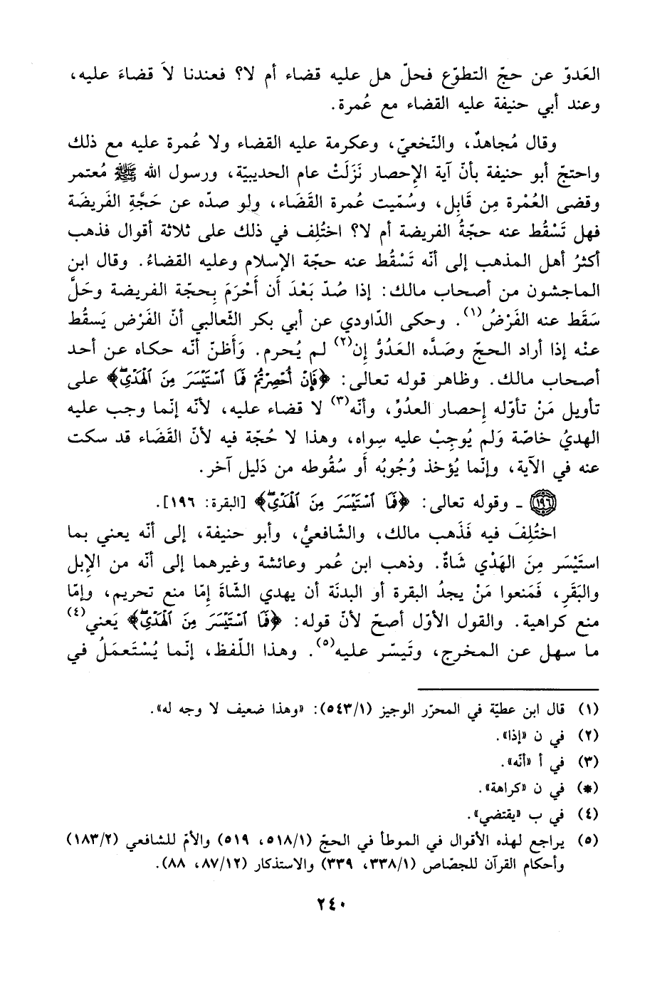 وقال مجاهد، والنخعي، وعكرمة عليه القضاء ولا عمرة عليه مع ذلك واحتج أبو حنيفة بأن آية الإحصار نزلت عام الحديبية، ورسول الله صلى الله عليه وسلم معتمر وقضى العمرة من قابل، وسميت عمرة القضاء، ولو صده عن حجة الفريضة فهل تسط عنه حجة الفريضة أم لا؟ اختلف في ذلك على ثلاثة أقوال فذهب أكثر أهل المذهب إلى أنه تسقط عنه حجة الإسلام وعليه القضاء. وقال ابن الماجشون من أصحاب مالك: إذا صد بعد أن أحرم بحجة الفريضة وحل سقط عنه الفرض. وحكى الداودي عن أبي بكر الثعالبي أن الفرض يسقط عنه إذا أراد الحج وصده العدو إن لم يحرم. وأظن أنه حكاه عن أحد أصحاب مالك. وظاهر قوله تعالى: {فإن أحصرتم فما استيسر من الهدي} على تأويل من تأوله إحصار العدو، وأنه لا قضاء عليه، لأنه إنما وجب عليه الهدي خاصة ولم يوجب عليه سواه، وهذا لا حجة فيه لأن القضاء قد سكت عنه في الىية، وإنما يؤخذ وجوبه أو سقوطه من دليل آخر.