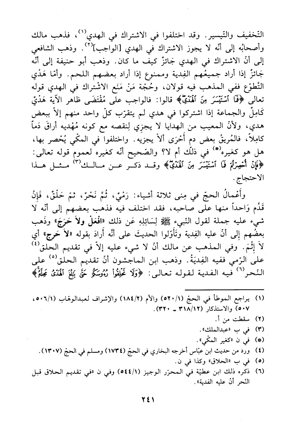 وأعمال الحج في منى ثلاثة أشياء: رمي، ثم نحر، ثم حلق، فإن قدم واحدًا منها على صاحبه، فقد اختلف فيه فذهب بعضهم إلى أنه لا شيء عليه جملة لقول النبي صلى الله عليه وسلم لسائله عن ذلك ((افعل ولا حرج)) وذهب بعضهم إلى أن عليه الفدية وتأولوا الحديث على أنه أراد بقوله ((لا حرج)) أي لا إثم. وفي المذهب عن مالك أن لا شيء عليه في تقديم الحلق على الرمي ففيه الفدية لقوله تعالى: {ولا تحلقوا رؤوسكم حتى يبلغ الهدي محله}