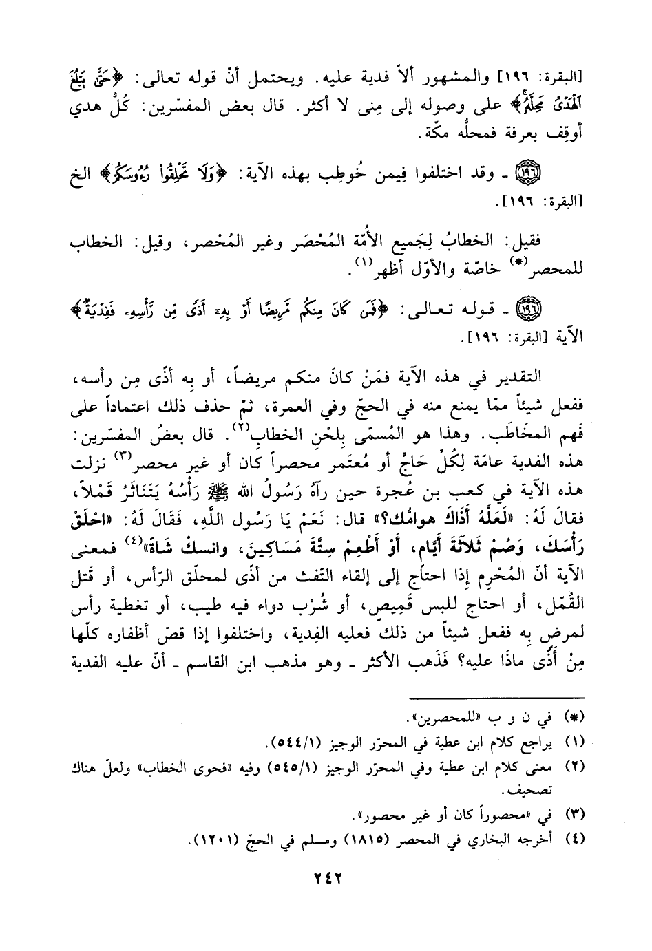 التقدير في هذه الآية فمن كان منكم مريضًا، أو به اذى من رأسه، ففعل شيئًا مما يمنعمنه في الحج وفي العمرة، ثم حذف ذلك اعتمادًا على فهم المخاطب. وهذا هو المسمى بلحن الخطاب. وقال بعض المفسرين: هذه الفدية عامة لكل حاج أو معتمر محصرًا كان أو غير محصر نزلت هذه الآية في كعب بن عجرة حين رآه رسول الله صلى الله عليه وسلم رأسه يتناثر قملًا، فقال له: ((لعله أذاك هوامك؟ )) قال: نعم يا رسول الله، فقال له: ((احلق رأسك، وصم ثلاثة أيام، أو أطعم ستة مساكين، وانسك شاة)) فمعنى الآية أن المحرم إذا احتاج للبس قميص، أو شرب دواء فيه طيب، أو تغطية رأس لمرض به ففعل شيئًا من ذلك فعليه الفدية، واختلفوا إذا قص اظفاره كلها من اذى ماذا عليه؟ فذهب الأكثر -وهو مذهب ابن القاسم- أن عليه الفدية