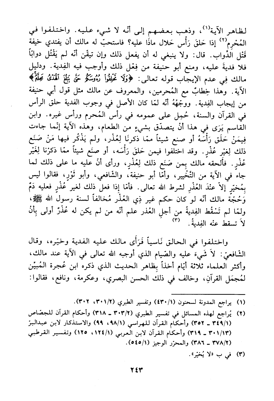 لظاهر الآية، وذهب بعضهم إلى أنه لا شيء عليه. واختلفوا في المحرم إذا حلق رأس حلال ماذا عليه؟ فاستحب له مالك أن يفتدي خيفة قتل الدواب. قال: ولا ينبغي له أن يفعل ذلك وإن تيقن أنه لم يقتل دوابًا فلا فدية عليه، ومنع أبو حنيفة من فعل ذلك وأوجب فيه الفدية. ودليل مالك في عدم الإيجاب قوله تعالى: {ولا تحلقوا رؤوسكم حتى يبلغ الهدي محله} الآية. وهذا خطاب مع المحرمين، والمعروف عن مالك مثل قول أبي حنيفة من إيجاب الفدية. ووجهه أنه لما كان الأصل في وجوب الفدية حلق الرأس في القرآن والسنة، حمل على عمومه في رأس المحرم ورأس غيره. وابن القاسم يرى في هذا أن يتصدق بشيء من الطعام، وهذه الآية إنما جاءت فيمن حلق رأسه أو صنع شيئًا مما ذكرنا لعذر، ورأى أن عليه ما على ذلك لما جاء في الآية من التخيير، وأما أبو حنيفة، والشافعي، وأبو ثور، فقالوا ليس بمخير إلا عند العذر لشرط الله تعالى. فأما إذا فعل ذلك لغير عذر فعليه دم، وحجة مالك أنه لو كان حكم غير ذي العذر مخالفًا لسنة رسول الله صلى الله عليه وسلم ولما لم تسقط الفدية من أجل العذر علم أنه من لم يكن له عذر أولى بأن لا تسقط عنه الفدية.