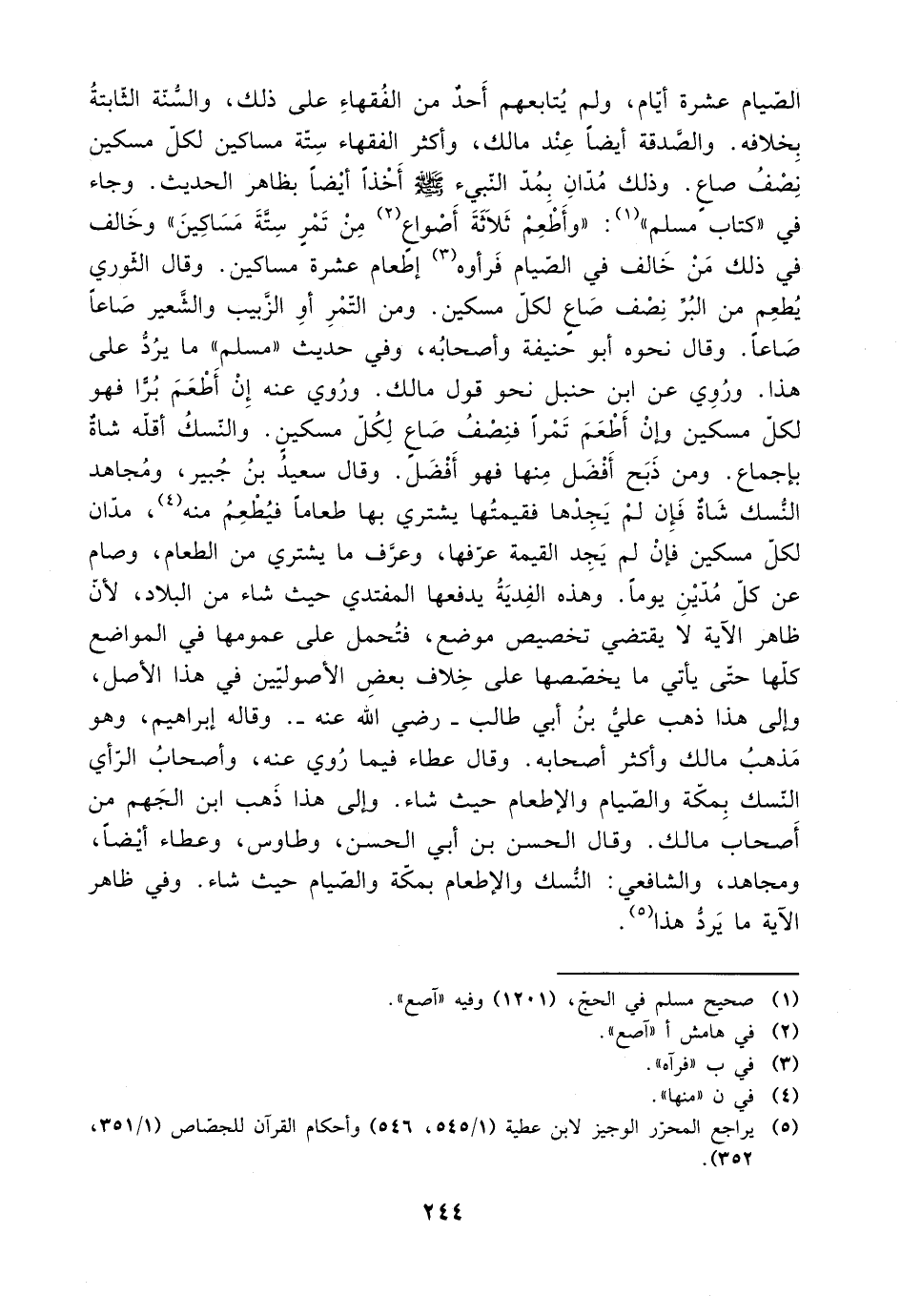 الصيام عشرة أيام، ولم يتابعهم أحد من الفقهاء على ذلك، والسنة الثابتة بخلافه. الصدقة أيضًا عند مالك، وأكثر الفقهاء ستة مساكين لكل مسكين نصف صاع. وذلك مدان بمد النبي صلى الله عليه وسلم أخذًا بظاهر الحديث. وجاء في ((كتاب مسلم)): ((واطعم ثلاثة أصواع من تمر ستة مساكين)) وخالف في ذلك من خالف في الصيام فرأوه إطعام عشرة مساكين. وقال الثوري يطعم من البر نصف صاع لكل مسكين. ومن التمر أو الزبيب والشعير صاعًا صاعًا. وقال نحوه أبو حنيفة وأصحابه، وفي حديث ((مسلم)) ما يرد على هذا. وروي عن ابن حنبل نحو قول مالك. وروي عنه إن أطعم برًا فهو لكل مسكين وإن أطعم تمرًا فنصف صاع لكل مسكين, والنسك أقله شاة بإجماع. ومن ذبح أفضل منها فهو أفضل. وقال سعيد بن جبير، ومجاهد النسك شاة فإن لم يجدها فقيمتها يشتري من الطعام، وصام عن كل مدين يومًا. وهذه الفدية يدفعها المفتدي حيث شاء من البلاد، لأن ظاهر الآية لا يقتضي تخصيص موضع، فتحمل على عمومها في المواضع كلها حتى يأتي ما يخصصها على خلاف بعض الأصوليين في هذا الأصل، وإلى هذا ذهب علي بن أبي طالب -رضي الله عنه-. وقال إبراهيم، وهو مذهب مالك وأكثر أصحابه. وقال عطاء فيما روي عنه، أصحاب الرأي النسك بمكة والصيام والإطعام حيث شاء. وإلى هذا ذهب ابن الجهم من أصحاب مالك. وقال الحسن بن أبي الحسن، وطاوس، وعطاء أيضًا، ومجاهد، والشافعي: النسك والإطعام بمكة والصيام بمكة والصيام حيث شاء. وفي ظاهر الآية ما يرد هذا.