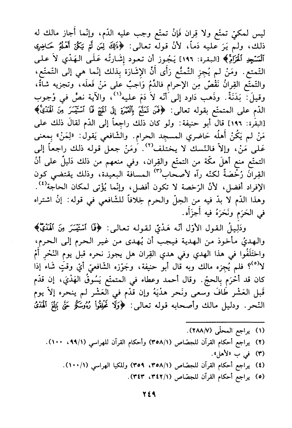 ليس لمكي تمتع ول قران فإن تمتع وجب عليه الدم، وغنما أجاز مالك له ذلك، ولم ير عليه دمًا، لأن قوله تعالى: {ذلك لمن لم يكن أهله حاضري المسجد الحرام} [البقرة: 196] يجوز ان تعود إشارته على الهدي لا على التمتع. ومن لم يجز التمتع رأى أن الإشارة بذلك إنما هي إلا التمتع، والتمتع القران نقص من الإحرام فالدم واجب على من فعله، وتجزيه شاة، وقيل: بدنة. وذهب داود إلى أنه لا دم عليه، والآية نص في وجوب الدم على المتمتع بقوله تعالى: {فمن تمتع بالعمرة إلى الحج فما استيسر من الهدي} [البقرة: 196] قال أبو حنيفة: ولو كان ذلك راجعًا إلى الدم لقال ذلك على من لم يكن أهله حاضري المسجد الحرام. والشافعي يقول: ((لمن)) بمعنى على من، وإلا فالنسك لا يختلف. ومن جعل قوله ذلك راجعًا إلى التمتع منع أهل مكة من التمتع والقران، وفي منعهم من ذلك دليل على أن القران رخصة لكنه رآه لأصحاب المسافة البعيدة، وذلك يقتضي كون الإفراد أفضل، لأن الرخصة لا تكون أفضل، وإنما يؤتى لمكان الحاجة. وهذا الدم لا بد فيه من الحل والحرم خلافًا للشافعي في قوله: إن اشتراه في الحرم ونحره فيه أجزاه.