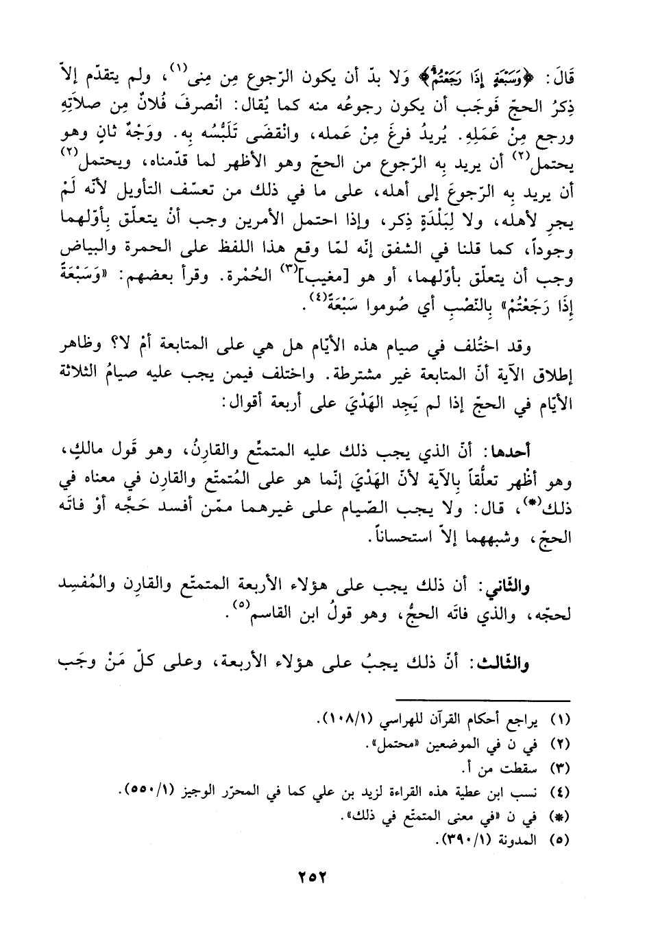 قال: {وسبعة إذا رجعتم} ولا بد أن يكون الرجوع من منى، ولم يتقدم إلا ذكر الحج فوجب أن يكون رجوعه منه كما يقال: انصرف فلان من صلاته ورجع من عمله. يريد فرغ من عمله، وانقضى تلبسه به. وووجه ثان وهو يحتمل أن يريد به الرجوع من الحج وهو الأظهر لما قدمناه، ويحتمل أن يريد به الرجوع إلى أهله، على ما في ذلك من تعسف التأويل لأنه لم يجر لأهله، ولا لبلدة ذكر، وإذا احتمل الأمرين وجب أن يتعلق بأولهما وجودًا، كما قلنا في الشفق إنه لما وقع هذا اللفظ على الحمرة والبياض وجب إن يتعلق بأولهما، أو هو [مغيب] الحمرة. وقرأ بعضهم: ((وسبعةً إذا رجعتم)) بالنصب أي صوموا سبعةً.