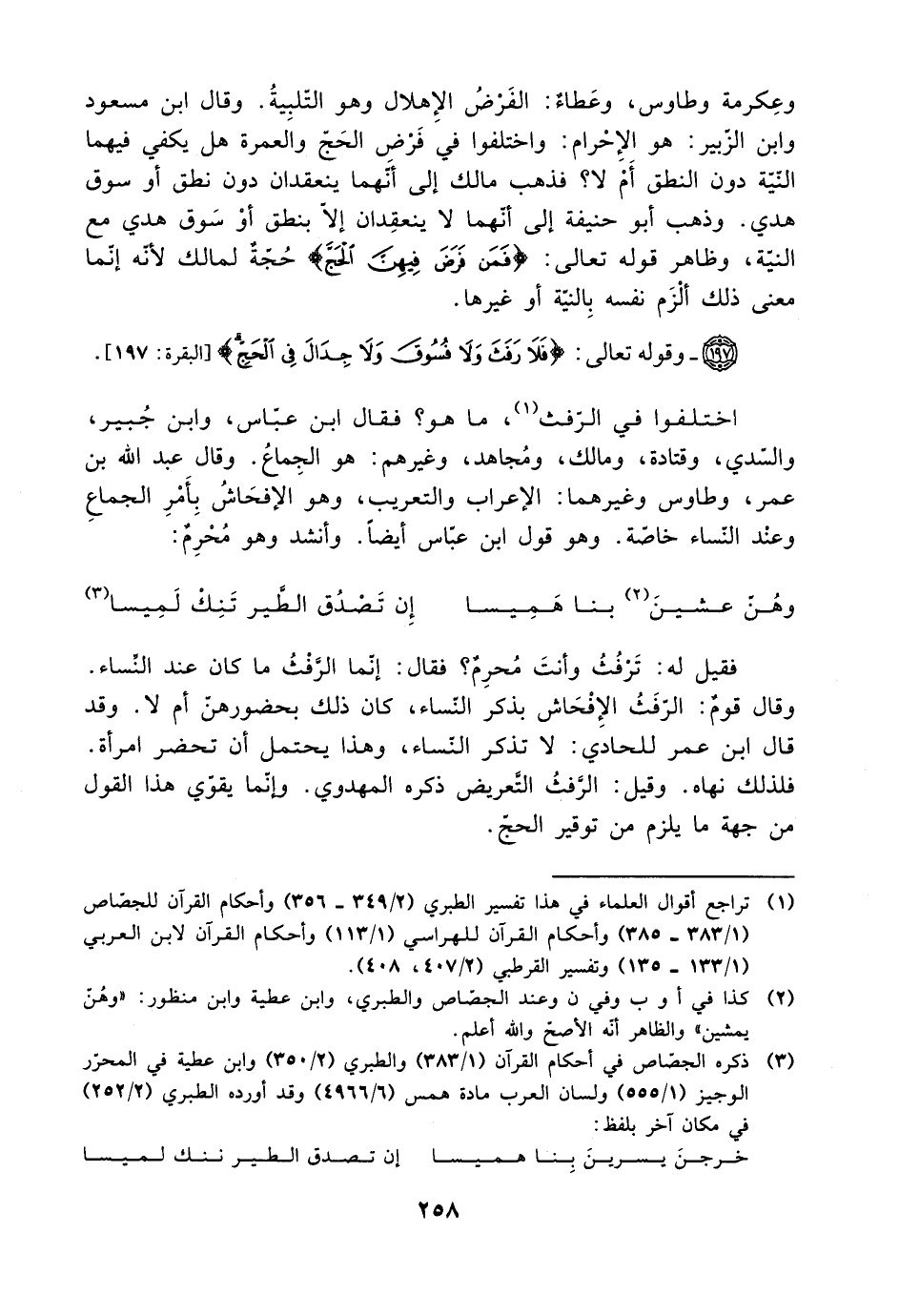اختلفوا في الرفث ما هو؟ فقال ابن عباس، وابن جبير، والسدي، وقتادة، ومالك، ومجاهد، وغيرهم: هو الجماع. وقال عبد الله بن عمر، وطاوس وغيرهما: الإعراب والتعريب، وهو الإفحاش بأمر الجماع وعند النساء خاصة. وهو قول ابن عباس أيضًا. وأنشد وهو محرم:
