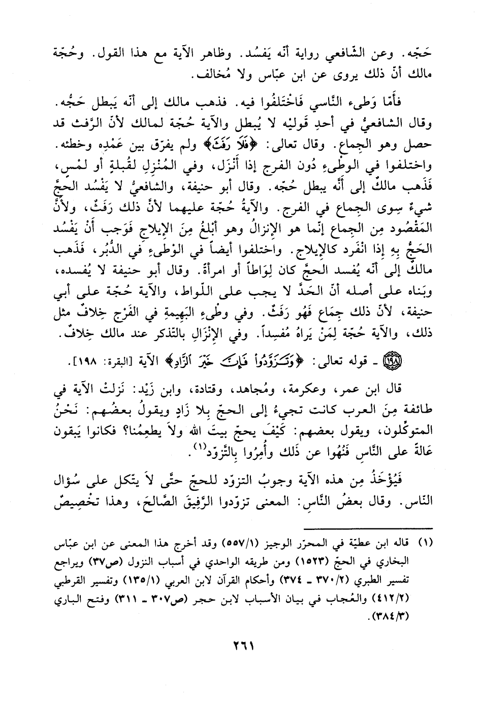 واختلفوا في الوطئ دون الفرج إذا أنزل، وفي المنزل لقبلة أو لمس، فذهب مالك إلى أنه يبطل حجه. وقال أبو حنيفة، والشافعي لا يفسد الحج سوى الجماع في الفرج. والآية حجة عليهما لأن ذلك رفث، ولأن المقصود من الجماع إنما هو الإنزال وهو أبلغ من الإيلاج فوجب أن يفسد الحج به إذا انفرد كالإيلاج. واختلفوا أيضًا في الوطئ في الدبر، فذهب مالك إلى أنه يفسد الحج كان لواطًا أو امرأة. ةقال أبو حنيفة لا يفسده، وبناه على أصله أن الحد لا يجب على اللواط، والآية حجة على أبي حنيفة، لأن ذلك جماع فهو رفث. وفي وطئ البهيمة في الفرج خلاف مثل ذلك، والآية حجة لمن يراه مفسدًا. وفي الإنزال بالتذكر عند مالك خلاف.