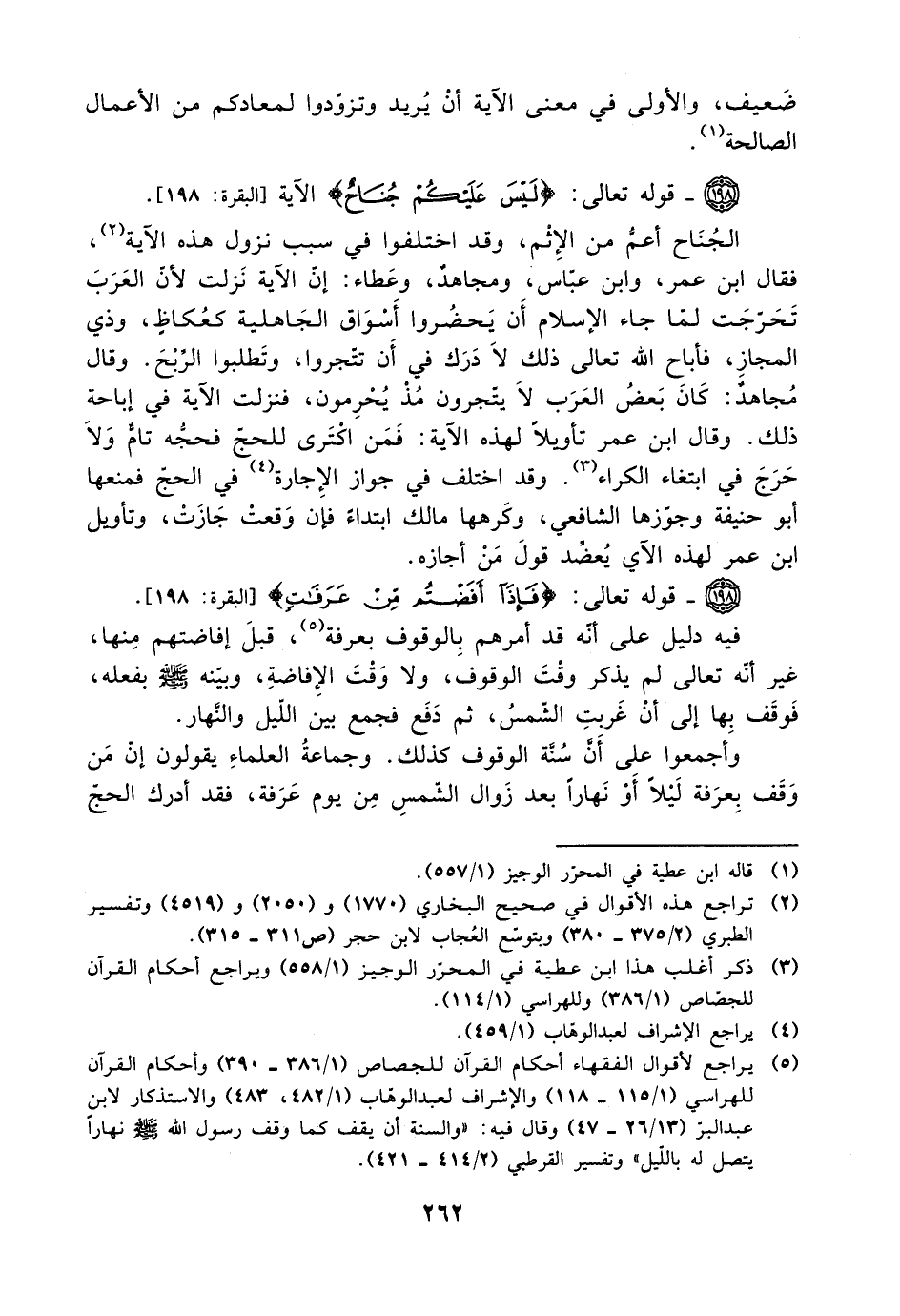 الجناح أعم من الإثم، وقد اختلفوا في سبب نزول هذه الآية، فقال ابن عمر، وابن عباس، ومجاهد، وعطاء: إن الآية نزلت لأن العرب تحرجت لما جاء الإسلام أن يحضروا أسواق الجاهلية كعكاظ، وذي المجاز، فأباح الله تعالى ذلك لا درك في أن تتجروا، وتطلبوا الربح. وقال مجاهد: كان بعض العرب لا يتجرون مذ يحرمون، فنزلت الآية في إباحة ذلك. وقال ابن عمر تأويلًا لهذه الآية: فمن اكترى للحج فحجه تام ولا حرج في ابتغاء الكراء. وقد اختلف في جواز الإجارة في الحج فمنعها ابو حنيفة وجوزها الشافعي، وكرهها مالك ابتداءً فإن وقعت جازت، وتأويل ابن عمر لهذه الآية يعضد قول من أجازه.