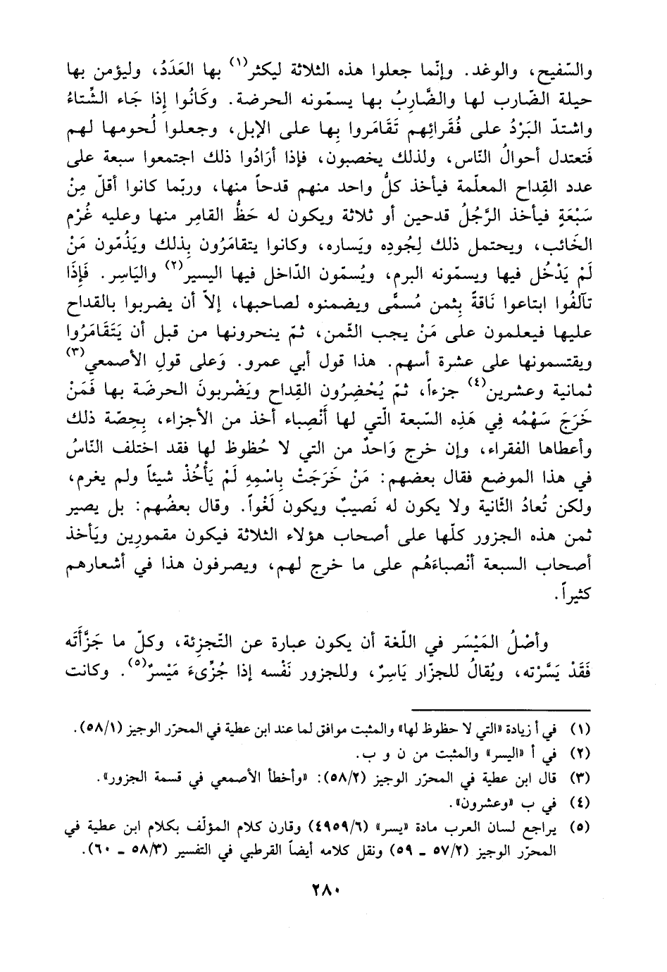 والسفيح، والوغد. وإنما جعلوا هذه الثلاثة ليكثر بها العدد، وليؤمن بها حيلة الضارب لها والصارب بها يسموه الحرضة. وكانوا إذا جاء الشتاء واشتد البرد على فقراتهم تقامروا بها على الإبل، وجعلوا لحومها لهم فتعتدل أحوال الناس، ولذلك يخصبون، فإذا أرادوا ذلك احتمعوا سبعة على عدد القداح المعلمة فيأخذ كل واحد منهم قدحًا منها، وربما كانوا أقل من سبعة فيأخذ الرجل قدحين أو ثلاثة ويكون له حظ القامر منها وعليه غرم الخائب، ويحتمل ذلك لجوده ويساره، وكانوا يتقامرون بذلك ويذمون من لك يدخل فيها ويسمونه البرم، ويسمون الداخل فيها اليسير والياسر. فإذا تآلفوا ابتاعوا ناقة بثمن مسمى ويضمنوه لصاحبها، إلا أن يضربوا بالقداح عليها فيعلمون على من يجب الثمن، ثم ينحرونها من قبل أن يتقامروا ويقتسمونها على عشرة أسهم. هذا قول أبي عمرو. وعلى قول الأصمعي ثمانية وعشرين جزءًا، ثم يحضرون القداح ويضبون الحرضة بها ثمانية وعشرين جزءًا، ثم يحضرون القداح ويضربون الحرضة بها فمن خرج سهمه في هذه السبعة التي لها أنصباء أخذ من الأجزاء، بحصة ذلك وأعطاها الفقراء، وإن خرج واحد من التي لا حظوظ لها فقد اختلف الناس في هذا الموضع فقال بعضهم: من خرجت باسمه لم يأخذ شيئًا ولم يغرم، ولكن تعاد الثانية ولا يكون له نصيب ويكون لغوًا. وقال بعضهم: بل يصير ثمن هذه الجزور كلها على أصحاب هؤلاء الثلاثة فيكون مقمورين ويأخذ أصحاب السبعة أنصبائهم على ما خرج لهم، ويصرفون هذا في إشعارهم كثيرًا.
