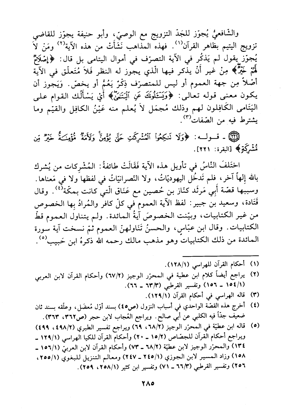اختلف الناس في تأويل هذه الآية فقالت طائفة: المشركات من يشرك بالله إلها آخر، فلم تدخل اليهوديات، ولا النصرانيات في لفظها ولا في معناها. وسببها قصة أبي مرثد كناز بن حصين مع عناق التي كانت بمكة. وقال قتادة وسعيد بن جبير: لفظ الآية العموم في كل كافر والمراد بها الخصوص من غير الكتابيات، وبينت الخصوص آية المائدة. ولم يتناول العموم قط الكتابيات. وقال ابن عباس، والحسن تناولهن العموم ثم نسخت آية سورة المائدة من ذلك الكتابيات وهو مذهب مالك رحمه الله ذكره ابن حبيب.