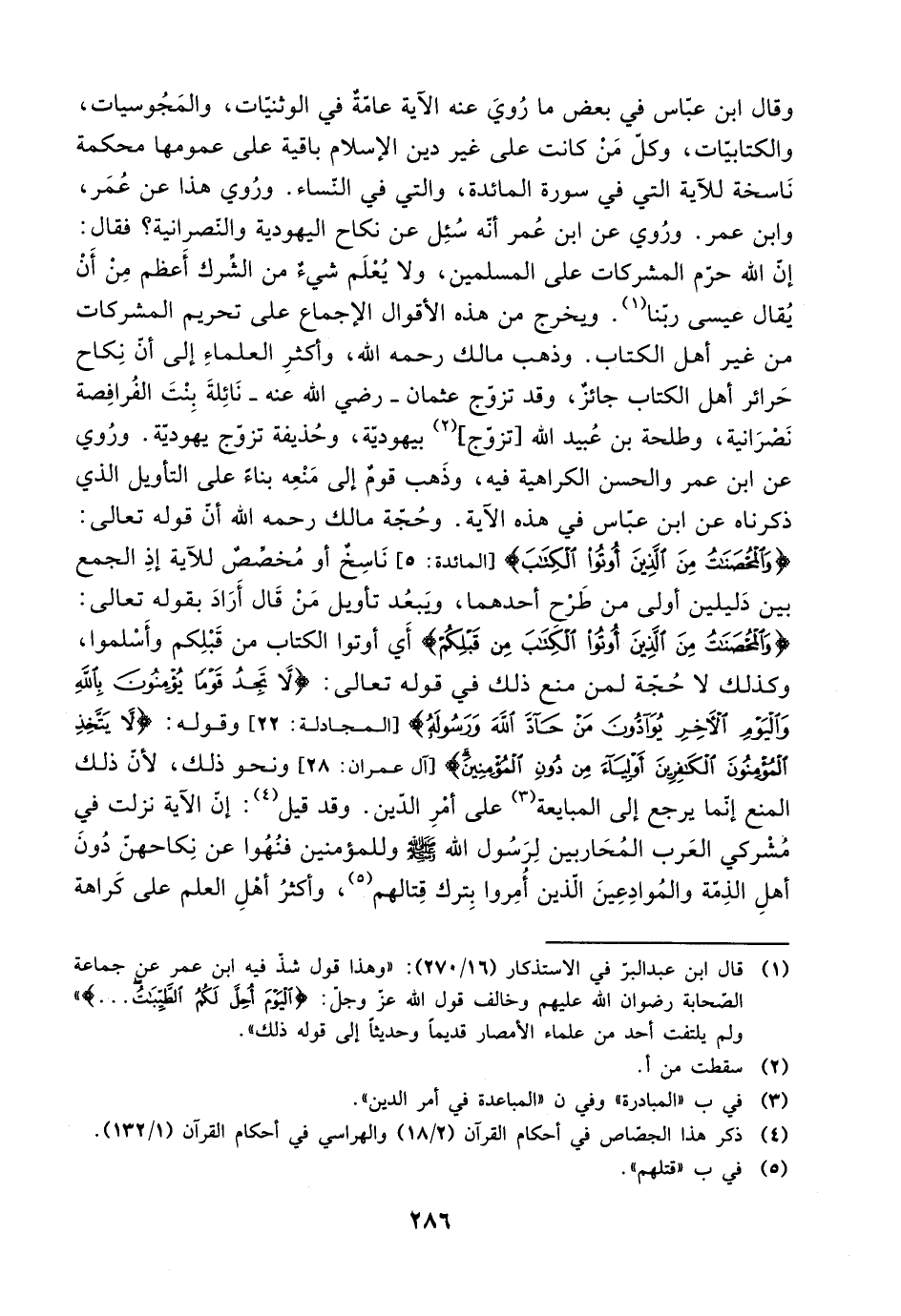 وقال ابن عباس في بعض ما روي عنه الآية عامة في الوثنيات، والمجوسيات، والكتابيات، وكل ما كانت على غير دين الإسلام باقية على عمومها محكمة ناسخة للآية التي في سورة المائدة، والتي في النساء. وروي هذا عن عمر، ابن عمر. وروي عن ابن عمر أنه سئل عن نكاح اليهودية والنصرانية؟ فقال: إن الله حرم المشركات على المسلمين، ولا يعلم شيء من الشرك أعظم من أن يقال عيسى ربنا. ويخرج من هذه الأقوال الإجماع على تحريم المشركات من غير أهل الكتاب. وذهب مالك رحمه الله وأكثر العلماء إلى أن نكاح حرائر أهل الكتاب جائز، وقد تزوج عثمان -رضي الله عنه- نائلة بنت الفرافصة نصرانية، وطلحة بن عبيد الله [تزوج] بيهودية، وحذيفة تزوج يهودية. وروي عن ابن عمر والحسن الكراهية فيه، وذهب قوم إلى منعه بناء على التأويل الذب ذكرناه عن ابن عباس في هذه الآية. وحجة مالك رحمه الله أن قوله تعالى: {والمحصنات من الذين أوتوا الكتاب} [المائدة: 5] ناسخ أو مخصص للآية إذ الجمع بين دليلين أولى من طرح أحدهما، ويبعد تأويل من قال أراد بقوله تعالى: {والمحصنات من الذين أوتوا الكتاب من قبلكم} أي أتوا الكتاب من قبلكم وأسلموا، وكذلك لا حجة لمن منع ذلك في قوله تعالى: {لا تجد قومًا يؤمنون بالله واليوم الآخؤ يوادون من حاد الله ورسوله} [المجادلة: 22] وقوله: {لا يتخذ المؤمنون الكافرين أولياء من دون المؤمنين} [آل عمران: 28] ونحو ذلك، لأن ذلك المنع إنما يرجع إلى المبايعة على أمر الدين. وقد قيل: إن الآية نزلت في مشركي العرب المحاربين لرسول الله صلى الله عليه وسلم وللمؤمنين فنهوا عن نكاحهن دون أهل الذمة والموادعين الذين أمروا بترك قتالهم، وأكثر أهل العلم على كراهة