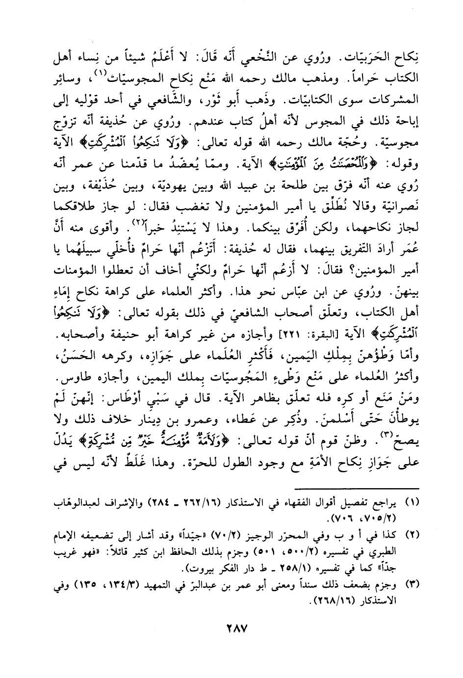 نكاح الحربيات. وروي عن النخعي أنه قال: لا أعلم شيئًا من نساء أهل الكتاب حرامًا. ومذهب مالك رحمه الله منع نكاح المجوسيات، وسائر المشركات سوى الكتابيات. وذهب أبو ثور، والشافعي في أحد قوليه إلى إباحة ذلك في المجوس لأن هأهل كتاب عندهم. وروي عن حذيفة أنه تزوج مجوسية. وحجة مالك رحمه الله قوله تعالى: {ولا تنكحوا المشركات} الآية وقوله: {والمحصنات من المؤمنات} الآية. ومما يعضد ما قدمنا عن عمر أنه روي عنه أنه فرق بين طلحة بن عبيد الله وبين يهودية، وبين حذيفة وبين نصرانية، وقالا نطلق يا أمير المؤمنين ولا تغضب، فقال: لو جاز طلاقكما لجاز نكاحهما، ولكن أفرق بينكما. وهذا لا يستند خبرًا. وأقوى منه أن عمر أراد التفريق بينهما، فقال له حذيفة: أتزعم أنها حرام فأخلي سبيلهما يا أمير المؤمنين؟ فقال: لا أزعم أنها حرام ولكني أخاف أن تعطلوا المؤمنات بينهن. وروي عن ابن عباس نحو هذا. وأكثر العلماء على كراهة نكاح إماء أهل الكتاب، وتعلق أصحاب الشافعي في ذلك بقوله تعالى: {ولا تنكحوا المشركات} الآية [البقرة: 221] وأجازه من غير كراهة أبو حنيفة أصحابه. وأم وطؤهن بملك اليمين، فأكثرالعلماء على جوازه، كرهه الحسن، وأكثر العلماء على منع وطئ المجوسيات بملك اليمين، وأجازه طاوس.