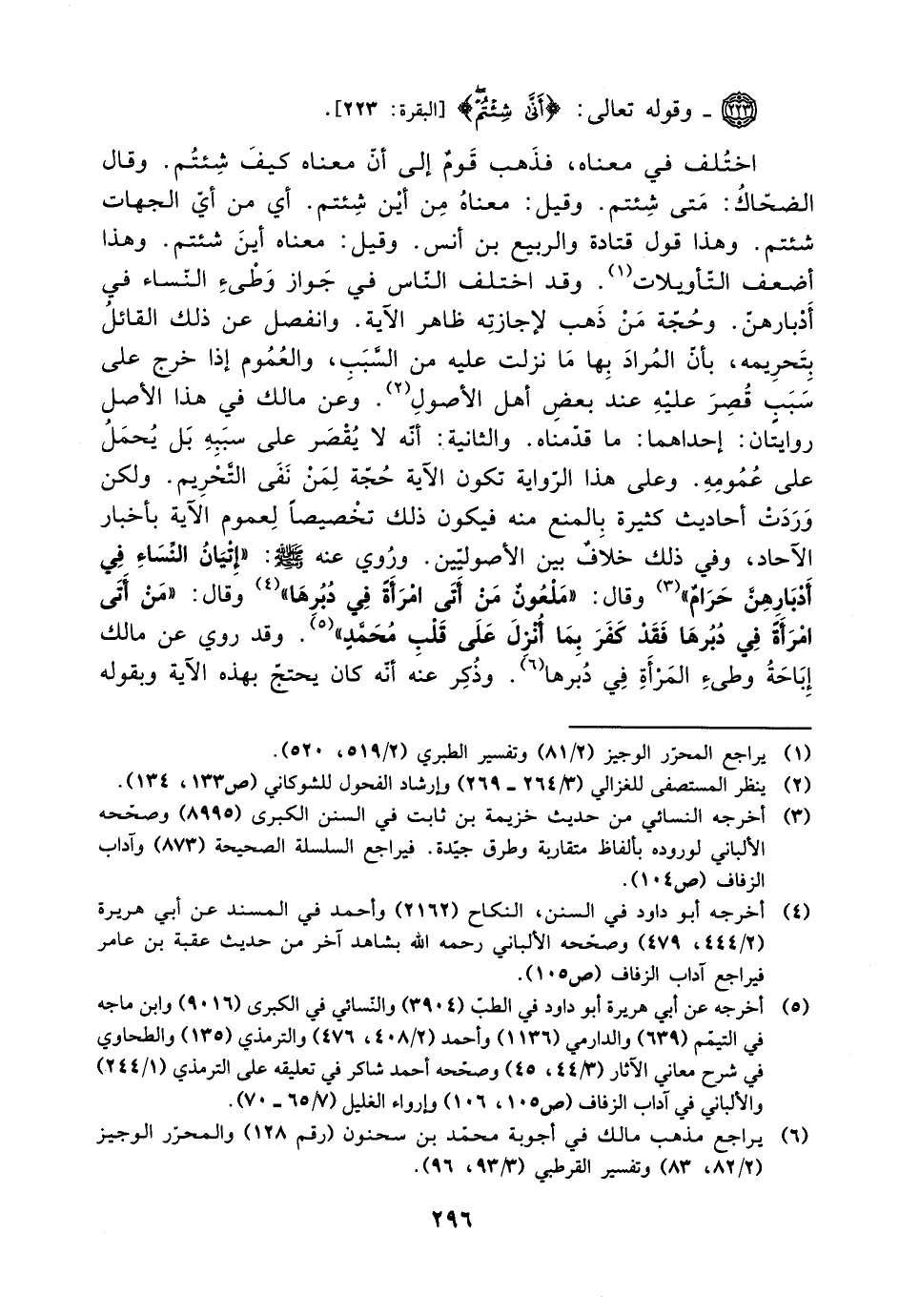 اختلف في معناه، فذهب قوم إلى أن معناه كيف شئتم. وقال الضحاك: متى شئتم. وقيل: معناه من أين شئتم. أي من أي الجهات شئتم. وهذا قول قتادة والربيع بن أنس. وقيل: معناه أين شئتم. وهذا أضعف التأويلات. وقد اختلف الناس في جواز وطئ النساء في أدبارهن. وحجة من ذهب لإجازته ظاهر الآية. وانفصل عن ذلك القائل بتحريمه، بأن المراد بها ما نزلت عليه من السبب، والعموم إذا خرج على سبب قصر عليه عند بعض أهل الأصول. وعن مالك في هذا الأصل روايتان: إحداهما: ما قدمناه. والثانية: أنه لا يقصر على سببه بل يحمل على عمومه. وعلى هذه الرواية تكون الآية حجة لمن نفى التحريم. ولكن وردت أحاديث كثيرة بالمنع منه فيكون ذلك تخصيصًا لعموم الآية بأخبار الآحاد، وفي ذلك خلاف بين الأصوليين. وروي عنه صلى الله عليه وسلم: ((إتيان النساء في أدبارهن حرام)) وقال: ((ملعون من أتى المرأة في دبرها)) وقال: ((من أتى امرأة في دبرها فقد كفر بما أنزل على قلب محمد)). وقد روي عن مالك إباحة وطئ المرأة في دبرها. وذكر عنه أنه كان يحتج بهذه الآية وبقوله
