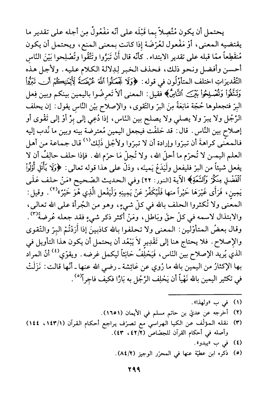وقال بعض المتأولين: المعنى ولا تحلفوا بالله كاذبين إذا أردتم البر والتقوى والإصلاح بين الناس، فيحلف حانثًا ليكمل غرضه. ويقوي أن المراد بها الإكثار من اليمين بالله ما روي عن عائشة -رضي الله عنها- أنها قالت: نزلت في تكثير اليمين بالله نهيًا أن يحلف الرجل بارًا فكيف فاجرًا.
