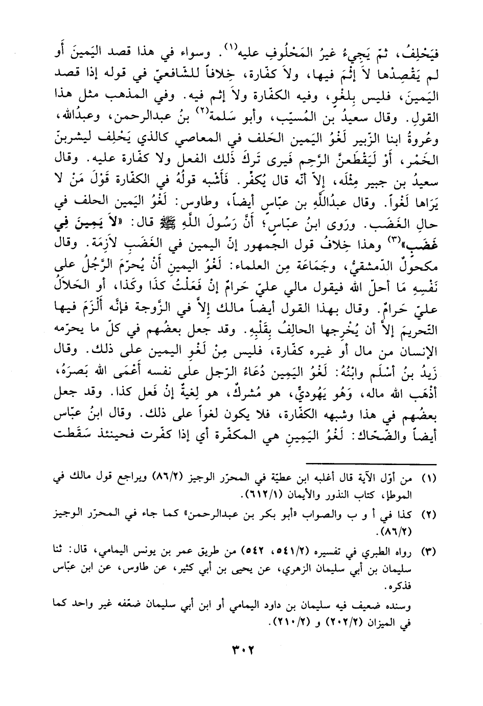 فيحلف، ثم يجيء غير المحلوف عليه. وسواء في هذا قصد اليمين أو لم يقصدها لا إثم فيها، ولا كفارة خلافًا للشافعي في قوله إذا قصد اليمين، فليس بلغو، وفيه الكفارة ولا إثم فيه. وفي المذهب مثل هذا القول. وقال سعيد بن المسيب، وابو سلمة بن عبد الرحمن، وعبد الله، وعروة ابنا الزبير لغو اليمين الحلف في المعاصي كالذي يحلف ليشربن الخمر، أو ليقطعن الرحم فيرى ترك ذلك الفعل ولا كفارة عليه. وقال سعيد بن جبير مثله، إلا أنه قال يكفر. فأشبه قوله في الكفارة قول من لا يراها لغوًا. وقال عبد الله بن عباس أيضًا، وطاوس: لغو اليمين الحلف قي حال الغضب. وروى ابن عباس؛ إن رسول الله صلى الله عليه وسلم قال: ((لا يمين في غضب)) وهذا خلاف قول الجمهور إن اليمين في الغضب لازمة. وقال مكحول الدمشقي، وجماعة من العلماء: لغو اليمين أن يحرم الرجل على نفسه ما احل الله فيقول مالي علي حرام إن فعلت كذا وكذا، أو الحلال على حرام. وقال بهذا القول أيضًا مالك إلا في الزوجة فإنه ألزم فيها التحريم إلا أن يخرجها الخالف بقلبه. وقد جعل بعضهم في كل ما يحرمه الإنسان من مال أو غيره كفارة، فليس من لغو اليمين على ذلك. وقال زيد بن أسلم وابنه: لغو اليمين دعاء الرجل على نفسه أعمى الله بصره، أذهب الله ماله، وهو يهودي، هو مشرك، هو لغية إن فعل كذا. وقد جعل بعضهم في هذا شبهه الكفارة، فلا يكون لغوًا على ذلك. وقال ابن عباس أيضًا والصحاك: لغو اليمين هي المكفرة أي إذا كفرت فحينئذ سقطت