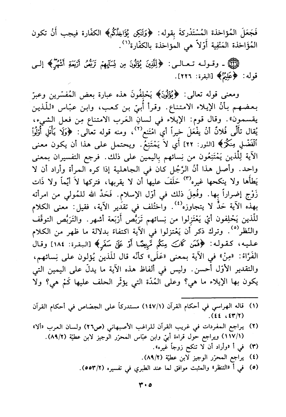 ومعنى قوله تعالى: {يؤلون} يحلفون هذا عبارة بعض المفسرين وعبر بعضهم بأن الإيلاء الامتناع. وقرأ أبي بن كعب، وابن عباس ((للذين يقسمون)). وقال قوم: الإيلاء في لسان العرب الامتناع من فعل الشيء، يقال تألى فلان أن يفعل خيرًا أي امتنع، ومنه قوله تعالى: {ولا يأتل أولوا الفضل منكم} [النور: 22] أي امتنع، ومنه قوله تعالى: {ولا يأتل ألوا الفضل منكم} [النور: 22] أي لا يمتنع. ويحتمل على هذا أن يكون معنى الآية للذين يمتنعون من نسائهم باليمين على ذلك. فرجع التفسيران بمعنى واحد. وأصل هذا أن الرجل كان في الجاهلية إذا كره المرأة وأراد أن لا يطأها ولا ينكحها غيره حلف عليها ألا يقربها، فتركها لا أيمًا ولا ذات زوج إضرارًا بها. وفعل ذلك في أول الإسلام. فحد الله للمولي من ارمأته بهذه الآية حدًا لا يتجاوزه. واختلف في تقدير الآية، فقيل: معنى الكلام للذين يحلفون أي يعتزلوا من نسائهم تربص أربعة أشهر. والتربص التوقف والنظر. وترك ذكر أن يعتزلوا في الآية اكتفاءً بدلالة ما ظهر من الكلام عليه، كقوله: {فمن كان منكم مريضًا أو على سفر} [البقرة: 184] وقال الفراء: ((من)) في الآية بمعنى ((على)) كأنه قال للذين يؤلون على نسائهم، والتقدير الأول أحسن. وليس في ألفاظ هذه الآية ما يدل على اليمين التي يكون بها الإيلاء ما هي؟ وعلى المدة التي يؤثؤ الحلف عليها كم هي؟ ولا