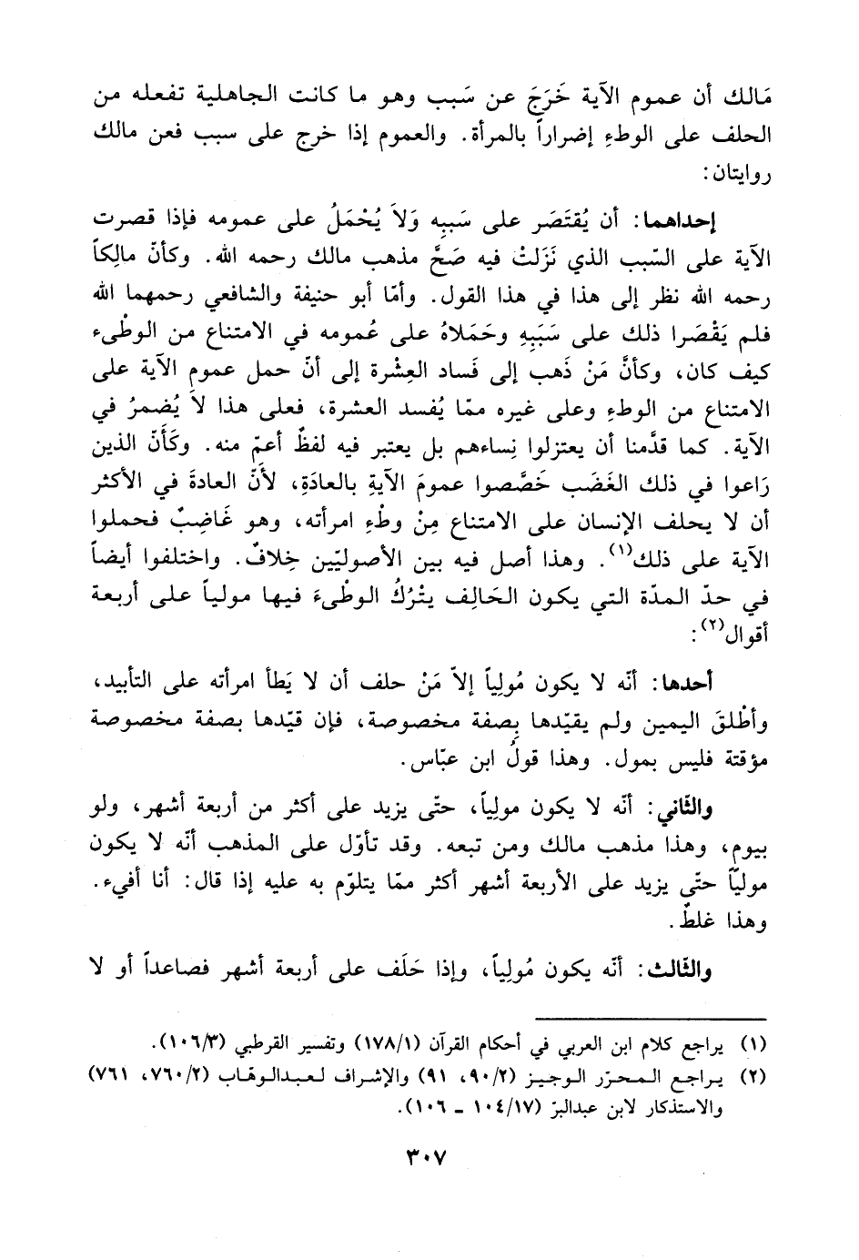 إحداهما: أن يقتصر على سببه ولا يحمل على عمومه فإذا قصرت الآية على السبب الذي نزلت فيه صح مذهب مالك رحمه الله. وكأن مالكًا رحمه الله نظر إلى هذا في هذا القول. وأما أبو حنيفة والشافعي رحمهما اله فلم يقصرا ذلك على سببه وحملاه على عمومه في الامتناع من الوطئ كيف كان، وكأن من ذهب إلى فساد العشرة إلى أن حمل عموم الآية على الامتناع عن الوطء وعلى غيره مما يفسد العشرة، فعلى هذا لا يضمر في الآية. كما قدمنا أن يعتزلوا نساءهم بل يعتبر فيه لفظ أعم منه. وكأن الذين راعوا في ذلك الغضب خصصوا عموم الآية بالعادة، لأن العادة في الأكثر أن لا يحلف الإنسان على الامتناع من وطء امرأته، وهو غاضب فحملوا الآية على ذلك. وهذا أصل فيه بين الأصوليين خلاف. واختلفوا أيضًا في حد المدة التي يكون الحالف يترك الوطئ فيها موليًا أربعة أقوال:
