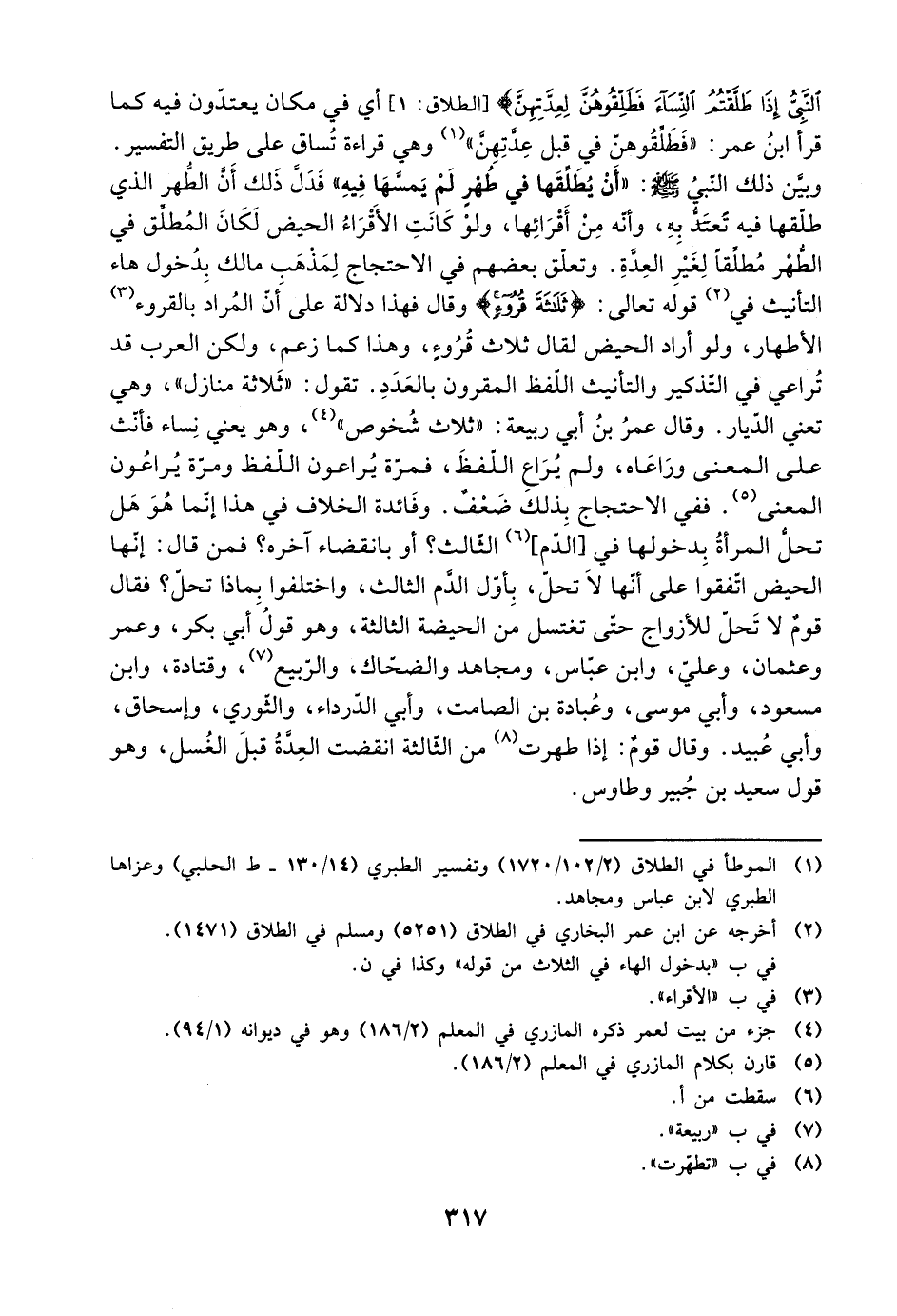 وبين ذلك النبي صلى الله عليه وسلم: ((أن يطلقها في طهر لم يمسها فيه)) فدل ذلك أن الطهر الذي طلقها فيه تعتد به، وأنه من أقراءها، ولو كانت الأقراء الحيض لكان المطلق في الطهر مطلقًا لغير العدة. وتعلق بعضهم في الاحتجاج لمذهب مالك بدخول هاء التأنيث في قوله تعالى: {ثلاثة قروء} وقال فهذا دلالة على أن المراد بالقروء الأطهار، ولو أراد الحيض لقال ثلاث قروء، وهذا كما زعم، ولكن العرب قد تراعي في التذكير والتأنيث اللفظ المقرون بالعدد. تقول: ((ثلاثة منازل))، وهي تعني الديار. وقال عمر بن أبي ربيعة: ((ثلاثة شخوص))، وهو يعني نساؤ فأنث على المعنى وراعاه، ولم يراع اللفظ، فمرة يراعون اللفظ ومرة يراعون المعنى. ففي الاحتجاج بذلك ضعف. وفائدة الخلاف في هذا إنما هة هل تحل المرأة بدخولها في [الدم] الثالث؟ أو بانقضاء آخره؟ فمن قال: إنها الحيض اتفقوا على أنها لا تحل، باول الدم الثالث، واختلفوا بماذا تحل؟ فقال قوم لا تحل للأزواج حتى تغتسل من الحيضة الثالثة، وهو قول أبي بكر، وعمر وعثمان، وعلي، وابن عباس، ومجاهد، والضحاك، والربيع، وقتادة، وابن مسعود، وأبي موسى، وعبادة بن الصامت، وأبي الدرداء، والثوري، وإسحاق، وأبي عبيد. وقال قوم: إذا طهرت من الثالثة انقضت العدة قبل الغسل، وهو قول سعيد بن جبير وطاوس.