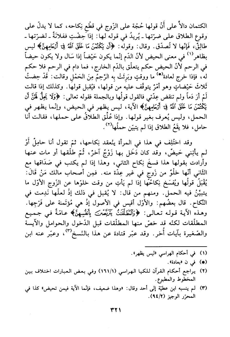 الكتمان دالًا على أن قولها حجة على الزوج في قطع نكاحه، كما لا يدل على وقوع الطلاق على ضرتها -يريد في قوله لها: إذا حضت ففلانة -لضرتها- طالق، فإنها لا تصدق. وقال: وقوله: {أن يكتمن ما خلق الله في أرحامهن} ليس بظاهر في معنى الحيض لأن الدم إنما يكون حيضًا إذا سال ولا يكون حيضًا في الرحم لأن الحيض حكم يتعلق بالدم الخارج، فما دام في الرحم فلا حكم له، فإذا خرج لعادة ما ووقت وبرئت به الرحم من الحمل وقالت: قد حضت ثلاث حيضات وهو أمر يتوقف عليه من قولها، فيقبل قولها. وكذلك إذا قالت لم أر دمًا ولم تنقض عدتي فالقول قولها وبالجملة فقوله تعالى: {ولا يحل لهن أن يكتمن ما خلق الله في أرحامهن} الآية، ليس يظهر في الحيض، وإنما يظهر في الحمل، وليس يعرف بغير قولها. وإذا علق الطلاق على حملها، فقالت أن حامل، فلا يقع الطلاق إذا لم يتبين حملها.