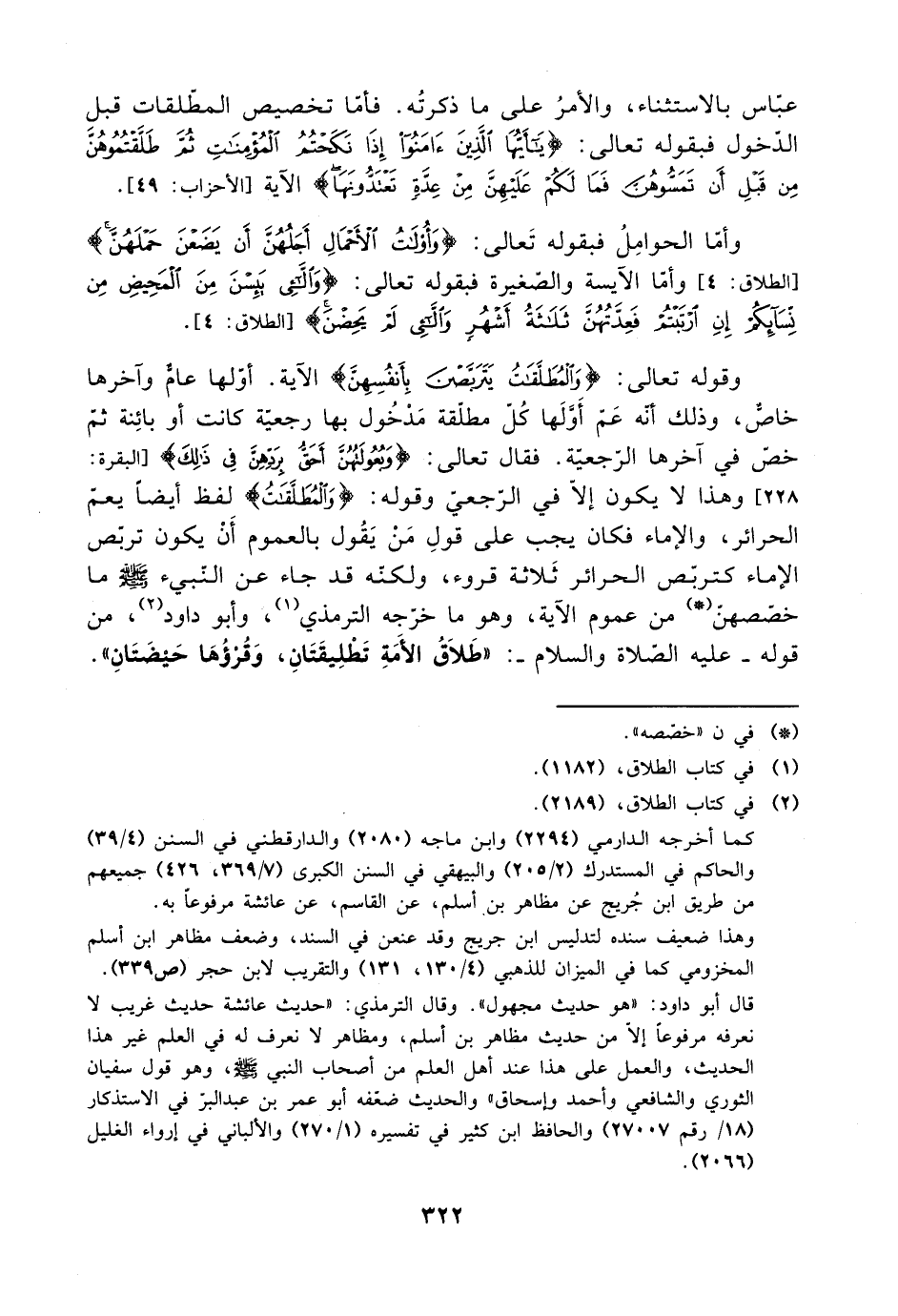 وقوله تعالى: {والمطلقات يتربصن بأنفسهن} الآية. أولها عام وآخرها خاص، وذلك أنه عم أولها كل مطلقة مدخول بها رجعية كانت أو بائنة ثم خص في آخرها الرجعية. فقال تعالى: {وبعولتهن أحق بردهن في ذلك} [البقرة: 228] وهذا لا يكون إلا في الرجعي وقوله: {والمطلقات} لفظ أيضًا يعم الحرائر، والإماء فكان يجب على قول من يقول بالعموم أن يكون تربص الإماء كتربص الحرائر ثلاثة قروء، ولكنه قد جاء عن النبي صلى الله عليه وسلم ما خصصهن من عموم الآية، وهو ما خرجه الترمذي، وأبو داود، من قوله -عليه الصلاة والسلام-: ((طلاق الأمة تطليقتان، وقرؤها حيضتان)).