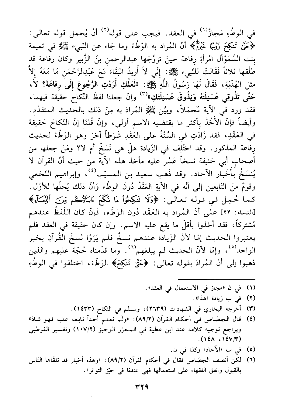 وأيضًا فإن الأخذ بأكثر ما يقتضيه الاسم أولى، وإن قلنا إن النكاح حقيقة في العقد، فقد زادت في السنة على العقد شرطًا آخر وهو الوطء لحديث رفاعة المذكور. وقد اختلف في الزيادة هل هي نسخ أم لا؟ ومن جعلها من أصحاب أبي حيفة نسخًا عسر مأخذ هذه الآية من حيث أن القرآن لا ينسخ بأخبار الآحاد. وقد ذهب سعيد بن المسيب، وإبراهيم النخعي وقوم من التابعين إلى أنه في الآية العقد دون الوطء وأن ذلك يحلها للأول.