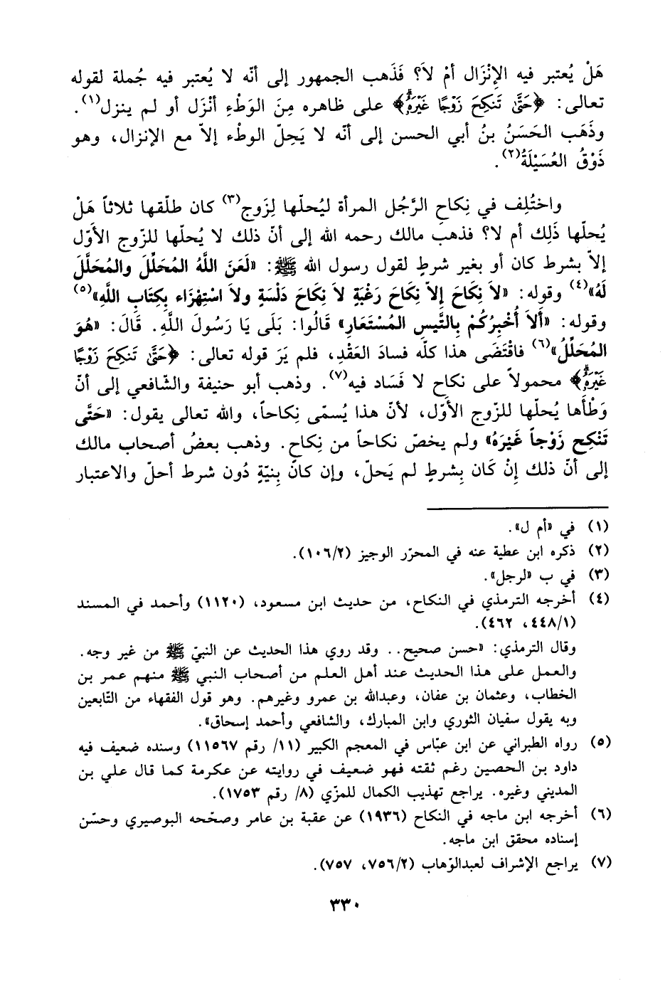 واختلف في نكاح الرجل المرأة ليحلها لزوج كان طلقها ثلاثًا هل يحل ذلك أم لا؟ فذهب مالك رحمه الله إلى أن ذلك لا يحلها للزوج الأول إلا بشرط كان أة بغير شرط لقول رسول الله صلى الله عليه وسلم: ((لعن الله المحلل والمحلل له)) وقوله: ((لا نكاح إلا نكاح رغبة لا نكاح دلسة ولا استهزاء بكتاب الله)) وقوله: ((ألأ أخبركم بالتيس المستعار)) قالوا: بلى يا رسول الله. قال: ((هو المحلل)) فاقتضى هذا كله فساد العقد، فلم ير قوله تعالى: {حتى تنكح زوجًا غيره} ولم يخص نكاحًا من نكاح. وذهب بعض أصحاب مالك إلى أن ذلك إن كان بشرط لم يحل، وإن كان بنية دون شرط أحل والاعتبار