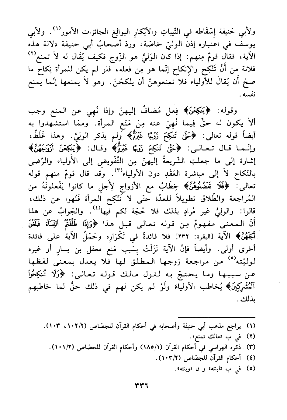 ولأبي حنيفة إسقاطه في الثيبات والأبكار البوالغ الجائزات الأمور. ولأبي يوسف في اعتباره إذن الولي خاصة، ورد أصحاب أبي حنيفة دلالة هذه الآية، فقال قوم منهم: إذا كان الولي هو الزوج فكيف يقال له لا تمنع فلانة من أن تنكح والإنكاح إنما هو من فعله، فلو لم يكن للمرأة نكاح ما صح أن يقال للأولياء فلا تمنعوهن أن ينكحن. وهو لا يمنعها إنما يمنع نفسه.