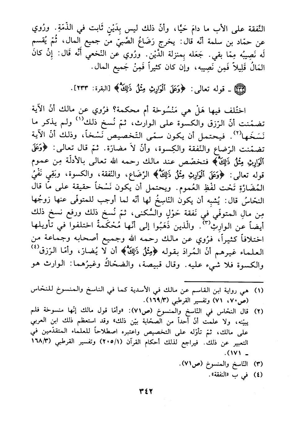 اختلف فيها هل هي منسوخة أم محكمة؟ فروي عن مالك أن الآية تضمنت أن الرزق والكسوة على الوارث، ثم نسخ ذلك ولم يذكر ما نسخها. فيحتمل أن يكون سمي التخصيص نسخًا، وذلك أن الآية تضمنت الرضاع والنفقة والكسوة، وأن لا مضارة. ثم قال تعالى: {وعلى الوارث مثل ذلك} فتخصص عند مالك رحمه الله تعالى بالأدلة من عموم قوله تعالى: {وعلى الوارث مثل ذلك} الرضاع، والنفقة، والكسوة، وبقي نفي المضارة تحت لفظ العموم. ويحتمل أن يكون نسخًا حقيقة على ما قال النحاس قال: يشبه أن يكون الناسخ لها أنه لما أوجب للمتوفى عنها زوجها من مال المتوفي في نفقة حولٍ والسكنى، ثم نسخ ذلك ورفع نسخ ذلك أيضًا عن الوارث. والذين ذهبوا إلى أنها محكمة اختلفوا في تأويلها اختلافًا كثيرًا، فروي عن مالك رحمه الله وجميع أصحابه وجماعة من العلماء غيرهم أن المراد بقوله {مثل ذلك} أن لا يضار، وأما الرزق الكسوة فلا شيء عليه. وقال قبيصة، والضحاك وغيرهما: الوارث هو