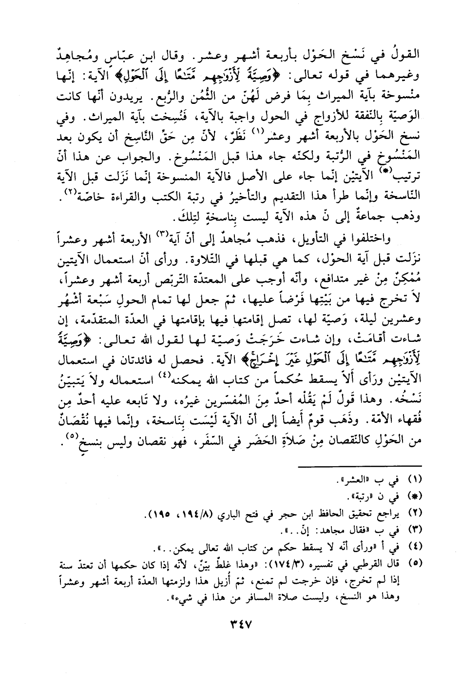 القول في نسخ الحول بأربعة أشهر وعشر. وقال ابن عباس ومجاهد وغيرهما في قوله تعالى: {وصية لأزواجهم متاعًا إلى الحول} الآية: إنها منسوخة بآية الميراث بما فرض لهن من الثمن والربع. يريدون أنها كانت الوصية بالنفقة للأزواج في الحول واجبة بالآية، فنسخت بآية الميراث. وفي نسخ الحول بالأربعة أشهر وعشر نظر، لأن من حق الناسخ أن يكون بعد المنسوخ في الرتبة ولكنه جاء هذا قبل المنسوخ. والجواب عن هذا أن ترتيب الآيتين إنما جاء على الأصل فالآية المنسوخة إنما نزلت قبل الآية الناسخة وإنما طرأ هذا التقديم والتأخير في رتبة الكتب والقراءة خاصة.